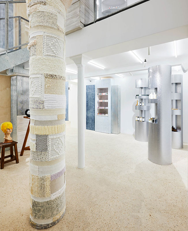 По своему дизайну магазин соответствует минималистской эстетике DSM, с голыми стенами и полами, без логотипов и без яркого дисплея. Посреди пространства — ряд колонн-тотемов, которые не дают рассмотреть все и сразу, но сами являются стеллажами для продуктов. В блеске стали и лака — вертикаль, украшенная вязанным панно, как напоминание о всем натуральном и ремесленном.