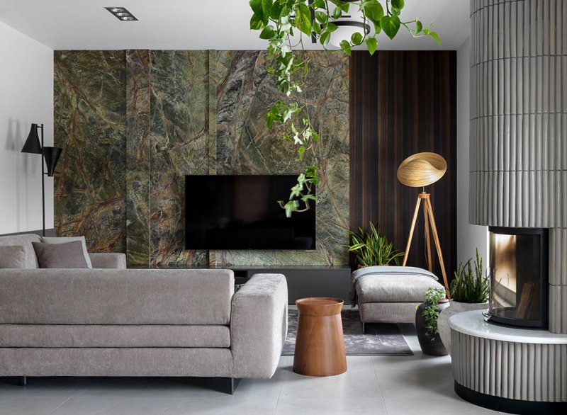 Гостиная. Панно из мрамора Bidasar Green и эвкалиптовых панелей.