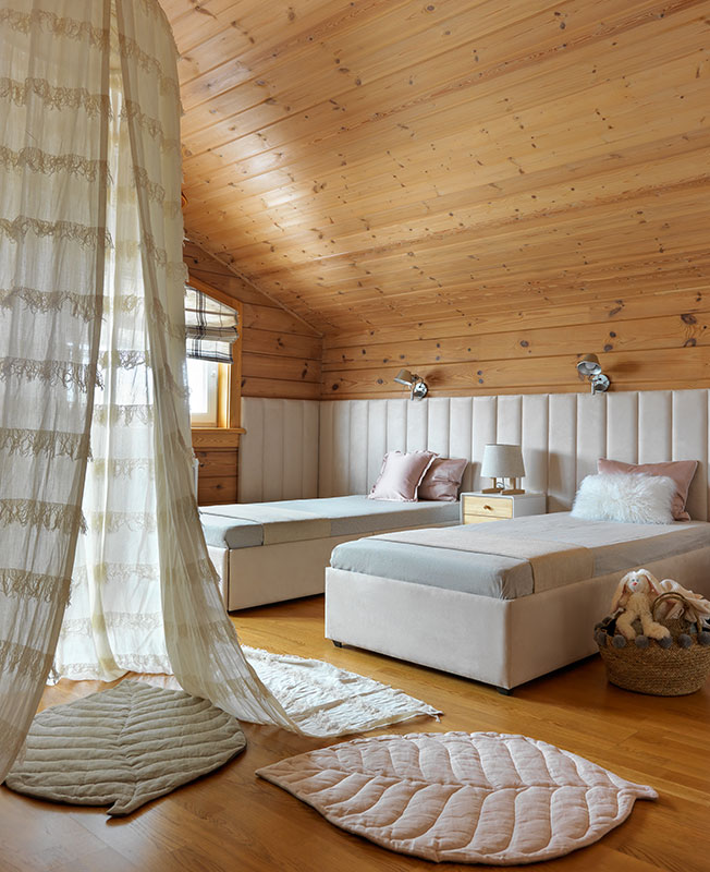 Комната дочерей. Мебель изготовлена на заказ по эскизам авторов проекта. Подушки и постельное белье Zara Home.