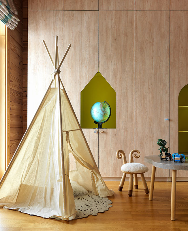 Детские для девочек сделали поэтичным местом, а комнату мальчика спроектировали на вырост, с просторнйо системой хранения и игровой палаткой. Некоторые вещи куплены в Париже, на выставке Maison & Objet.