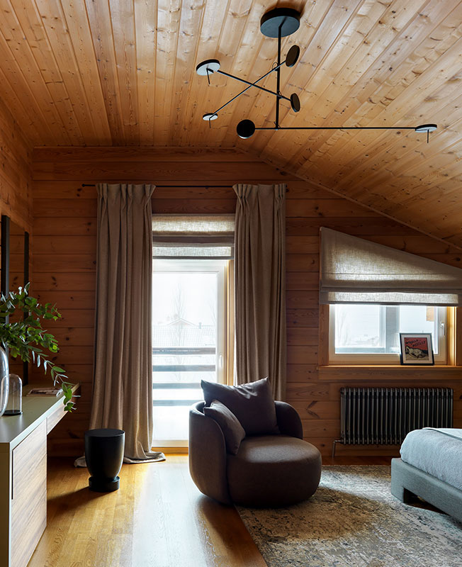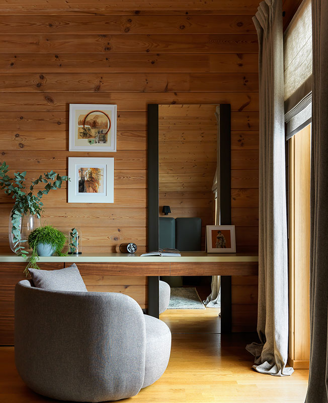 Дизайнеры Ангелина Бородкина и Ксения Евстафьева, Artists Collaboration, переделали интерьеры небольшого загородного дома площадью 200 кв. метров под Казанью. Прожив несколько лет в этом доме семья с четырьмя детьми решили обновить интерьер, который делался на скорую руку. Кроме того, хозяивам хотелось избавиться от ощущения городской квартиры и придать обстановке больше уюта, столь желанного в загородном доме. Перед дизайнерами стояла задача привнести в монотонное пространство больше фактувр и материалов, повторить природные мотивы, чтобы интерьер гармонично вторил окружающему ландшафту. Гостиная. Панно из мрамора Bidasar Green и эвкалиптовых панелей. Объединенная кухня-гостиная-столовая. Камин в отделке плиткой плиткой ручной работы местной керамистки Олеси Лукашенко. Зона столовой. Стулья Velis, диз. Марио Феррарини, Potocco. Потолочный светильник Palma, диз. Антони Арола, Vibia. Для одной из стены Ангелина и Ксения предложили сложную мраморную отделку модного зеленого оттенка. Красивым акцентом стала и древесина эвкалипта, которая по контрасту смотрится на общем нейтральном фоне стен. Прекрасный элемент загородной жизни — камин подчеркнули керамической плиткой ручной работы (автор — местный мастер Олеся Лукашенко). Потолочный светильник Palma, диз. Антони Арола, Vibia. Кухня в отделке эвкалиптом изготовлена на заказ по эскизам авторов проекта. Мастер-спальня в мансардном этаже. Особым украшением интерьера стали живые растения. Над обеденным столом висит светильник Palma, получивший премию German Design Award 2018. Его автор, дизайнер Антони Арола, считает, что Palma — «это ландшафтный проект, который со временем изменится как светящийся висячий сад». Фрагмент спальни. Туалетный столик изготовлен на заказ по эскизам авторов проекта. Фрагмент спальни. Туалетный столик изготовлен на заказ по эскизам авторов проекта. Картины, галерея Carre d'Artistes. Кабинет. Обои Arte дополнены панелями из шпона американского ореха. Детские для девочек сделали поэтичным местом, а комнату мальчика спроектировали на вырост, с просторнйо системой хранения и игровой палаткой. Некоторые вещи куплены в Париже, на выставке Maison