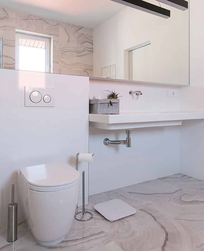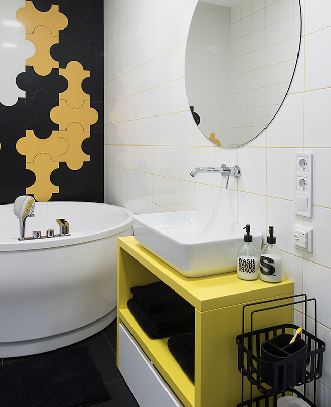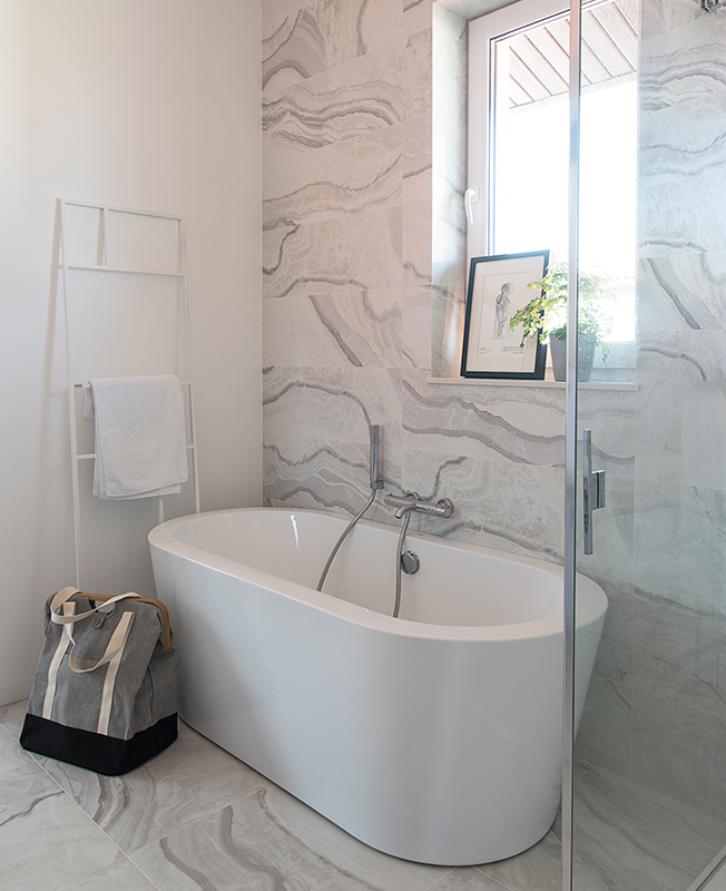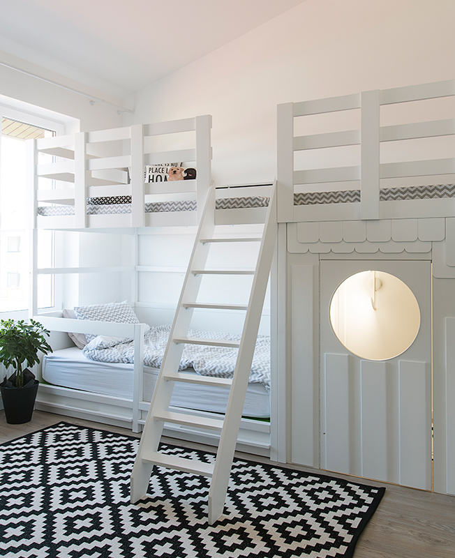 Спальню хозяев Елена сделала лаконичной, как и другие пространства в доме, чтобы «ничто не перетягивало на себя внимание, не отвлекало от общения или отдыха». Здесь преобладают белый и серые цвета, графичными акцентами служат рама кровати и светильники. Детская оформлена «в стиле хюгге», но тоже без лишних деталей. Самая яркая комната в доме — ванная, «чтобы утром взбодриться еще до умывания».