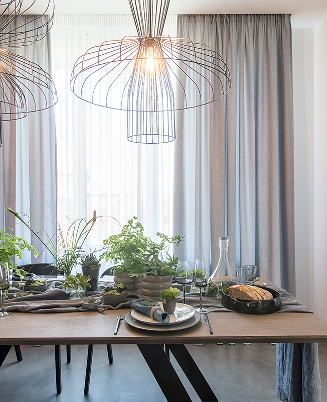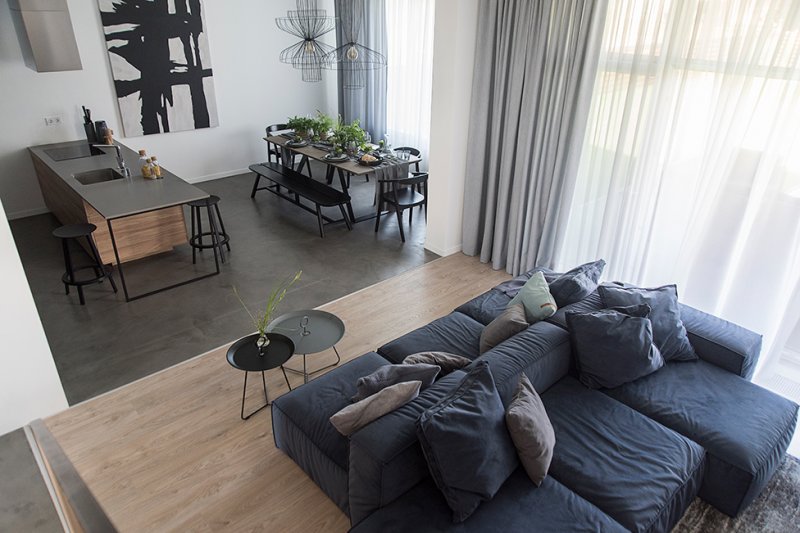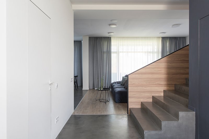 Дизайнер решила использовать минимум аксессуаров, украшением интерьера служат практичные элементы — люстры, лестница, кухонная вытяжка — и разнообразные фактуры, главными из которых стали бетон и древесина. «Для меня этот интерьер — пример того, как можно избежать скучности монохромной гаммы, применяя разные текстуры».