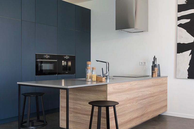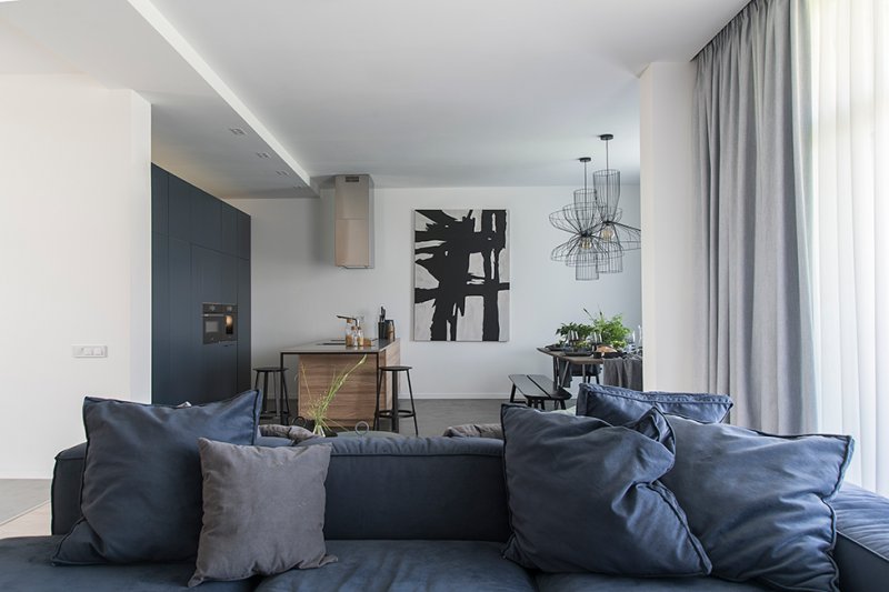 Заказчики мечтали о светлом пространстве, где можно готовить и общаться с гостями, сидящими на диване в гостиной. Оптимальным решением стала открытая планировка. В центре объединенного пространства поместили двухсторонний диван, удобный и для бесед, и для просмотра телевизора. Кухонный гарнитур, напротив, выбрали «невидимый», с гладкими фасадами. Остров, обеденный стол, стулья и светильники — с тонкими очертаниями, чтобы сделать зону визуально легче.