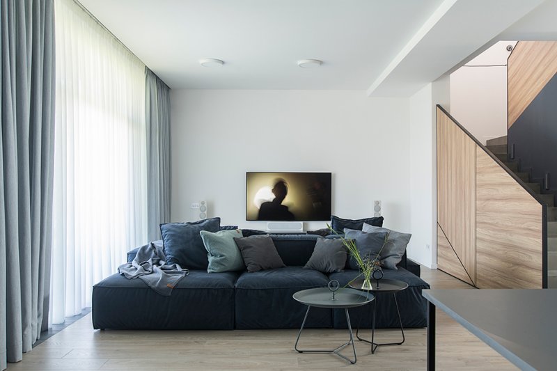 Елена взялась за проект, когда строительство было уже завершено. Планировка полностью устраивала заказчиков. «Клиенты хотели, чтобы интерьер помогал расслабиться, найти спокойствие и умиротворение, — рассказывает дизайнер. — Но главное – отдохнуть от работы и от всего, что с ней связано. Отсюда такой релаксирующий дизайн».