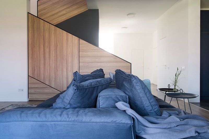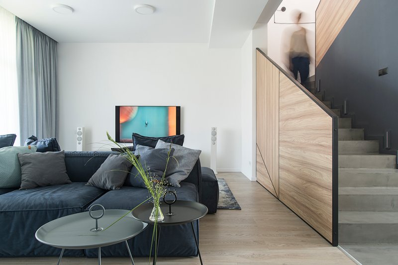 На первом этаже разместилась общая зона: гостиная, кухня, комната для гостей, прихожая с большим гардеробом и прачечная. На втором приватная: спальня хозяев с отдельной гардеробной, детская комната и еще одна спальня. Этажи соединяет широкая монолитная лестница. «Пролеты решили закрыть, а для маскировки использовали графичные деревянные панели — они же стали элементом общего дизайна», — говорит Елена.