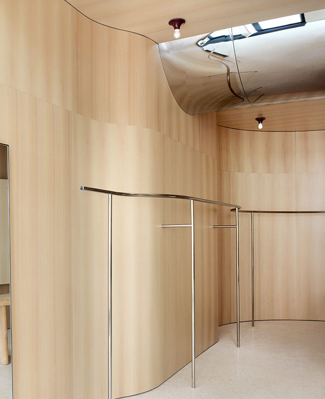 Для своего первого в истории флагмана модный бренд Toteme обратился к молодому шведскому дизайнеру Кристиану Халлероду, который тоже успел стать модным и заслуженно обрести поклонников. Быстрорастущий модный бренд был первоначально запущен в Нью-Йорке, но теперь, когда основатели Элин Клинг и Карл Линдман вернулись в Стокгольм, открытие здесь постоянной площадки стало естественным процессом. Toteme как и Халлерод создает «униформы», с которыми можно жить в гармонии — и эти параллели сделали их сотрудничество идеально подходящим. Двухэтажный интерьер отражает ДНК европейского минималистичного бренда. Дизайн фокусируется на чистых линиях и ар-деко, напоминающих о культовых нью-йоркских небоскребах Chrysler и Empire State. Элегантный и четкий интерьер характеризуется преобладанием черных и белых акцентов. Кристиан Халлерод выбрал в качестве отделки благородное дерево теплого оттенка, плитку нейтрального тона и экзотический камень. Скульптурная лестница поднимается с богато детализированной черной стальной балюстрадой понимается в центре. Облицованные деревом стены и потолок усиливают тепло и уют на первом этаже, в то время как второй этаж открывается в более светлое пространство с высокими окнами и решетчатым потолком со светодиодной подсветкой. На первом этаже находится стойка регистрации, а второй этаж похож на частные апартаменты в двухэтажном особняке. Усиливая домашний образ, план разделен на четыре части: библиотеку с книжным магазином и рабочим пространством, гостиную и спальню с настоящей кроватью и гардеробной.