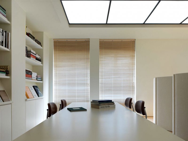 Скульптурная лестница поднимается с богато детализированной черной стальной балюстрадой понимается в центре. Облицованные деревом стены и потолок усиливают тепло и уют на первом этаже, в то время как второй этаж открывается в более светлое пространство с высокими окнами и решетчатым потолком со светодиодной подсветкой.