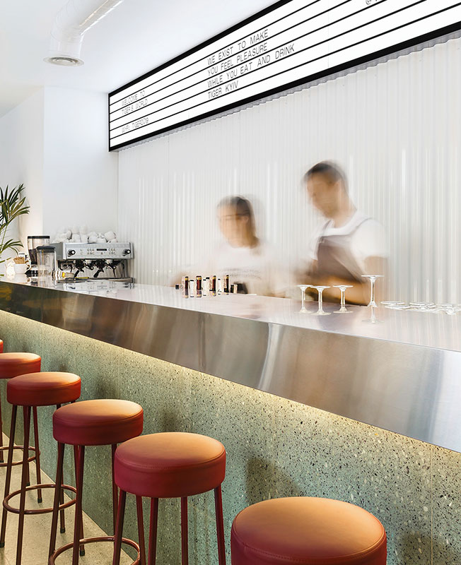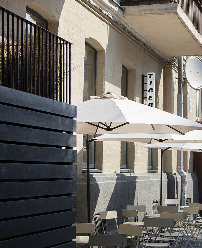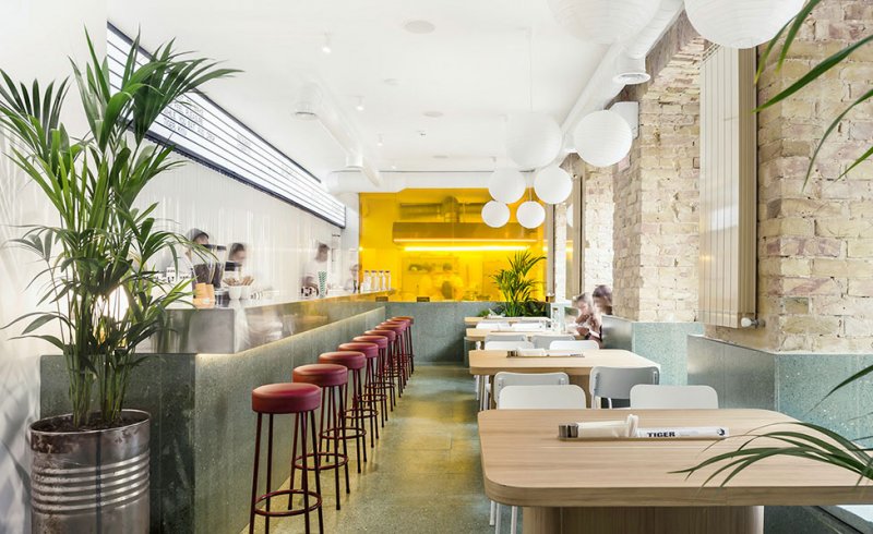 Руслан Литвиненко и Антон Вергун, архитектурная студия SHOVK, оформили интерьер ресторана паназиатской кухни Tiger. Заведение площадью 81 кв. метр расположено в центре Киева. Перед архитекторами стояла задача создать спокойный и ненавязчивый интерьер, одинаково подходящий для обеда, деловой встречи или чашки кофе, но при этом вызывающий интерес и желание зайти внутрь при взгляде с улицы. Фасад здания очистили от визуального мусора, а также расставили на улице несколько зонтов и столов со стульями для привлечения посетителей. Входная группа ресторана предельно лаконична — никаких вывесок, лишь стеклянные двери и манящее жизнерадостное пространство за ними. На входе использовали контрастный нейтральным стенам яркий желтый цвет, который в интерьере повторяется в стеклянной перегородке, которая отделяет открытую кухню от основного зала. Центром притяжения стала масштабная барная стойка с поверхностью из нержавеющей стали. Большое внимание авторы проекта уделили эргономике, о которой когда-то размышлял сам Ээро Сааринен, называя пространство под столом «уродливым, запутанным миром». Впоследствии американский архитектор финского происхождения решил отказаться от четырех ножек столов и стульев и придумал культовую коллекцию Tulip. Этим же путем пошла и команда SHOVK. Чтобы посетителям было удобнее вставать и садиться, архитекторы остановились на обеденных столах с одной, правда, массивной ножкой и скруглили края столешниц, т.к. посадка в заведении весьма плотная. Архитекторы также грамотно спланировали сценарии освещения. Днем пространство залито солнечным светом (или искусственным в пасмурную погоду), а вечером наоборот создается уютный полумрак. nonehttps://www.instagram.com/shovk.studio/https://www.facebook.com/shovkstudiohttp://shovk.com/ • Киев, улица Саксаганского, 40.
