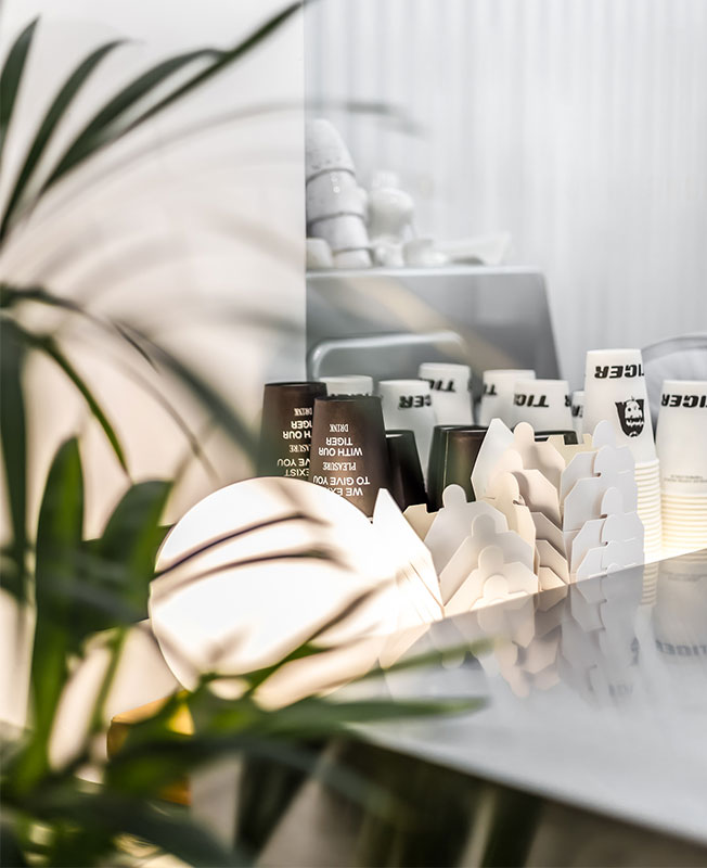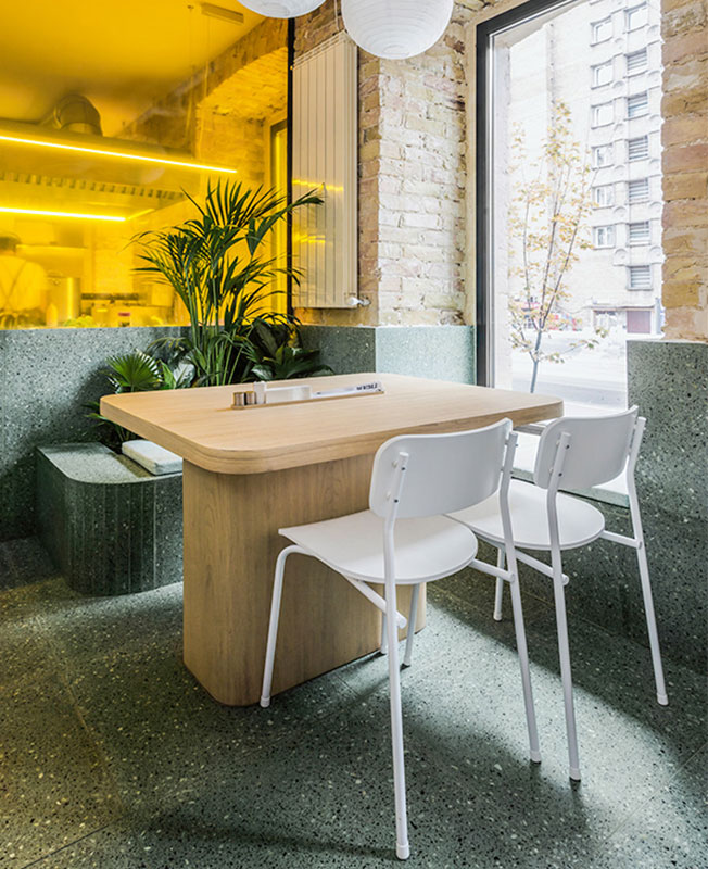 Большое внимание авторы проекта уделили эргономике, о которой когда-то размышлял сам Ээро Сааринен, называя пространство под столом «уродливым, запутанным миром». Впоследствии американский архитектор финского происхождения решил отказаться от четырех ножек столов и стульев и придумал культовую коллекцию Tulip. Этим же путем пошла и команда SHOVK. Чтобы посетителям было удобнее вставать и садиться, архитекторы остановились на обеденных столах с одной, правда, массивной ножкой и скруглили края столешниц, т.к. посадка в заведении весьма плотная.