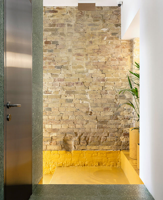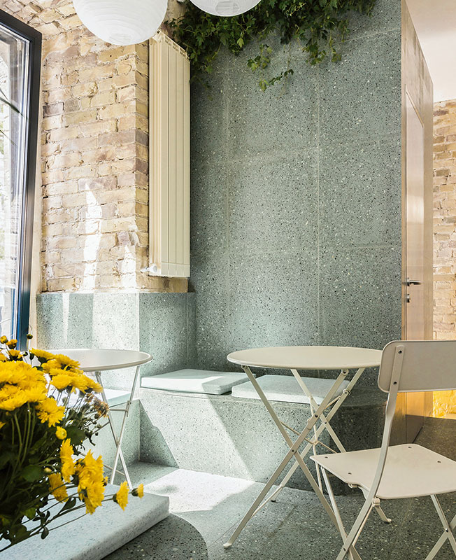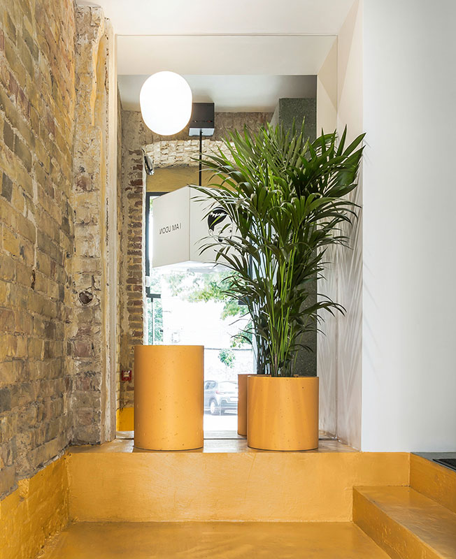 Фасад здания очистили от визуального мусора, а также расставили на улице несколько зонтов и столов со стульями для привлечения посетителей. Входная группа ресторана предельно лаконична — никаких вывесок, лишь стеклянные двери и манящее жизнерадостное пространство за ними.