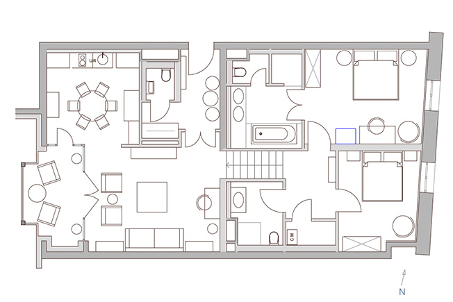 В свое время историческое здание (когда-то в нем располагался Земельный суд, Landgericht) пережило реконструкцию: к нему сделали пристройку. Поэтому квартира площадью 100 кв. метров расположена на двух уровнях, что положительно сказалось на планировке: общественная и приватная половины разнесены.