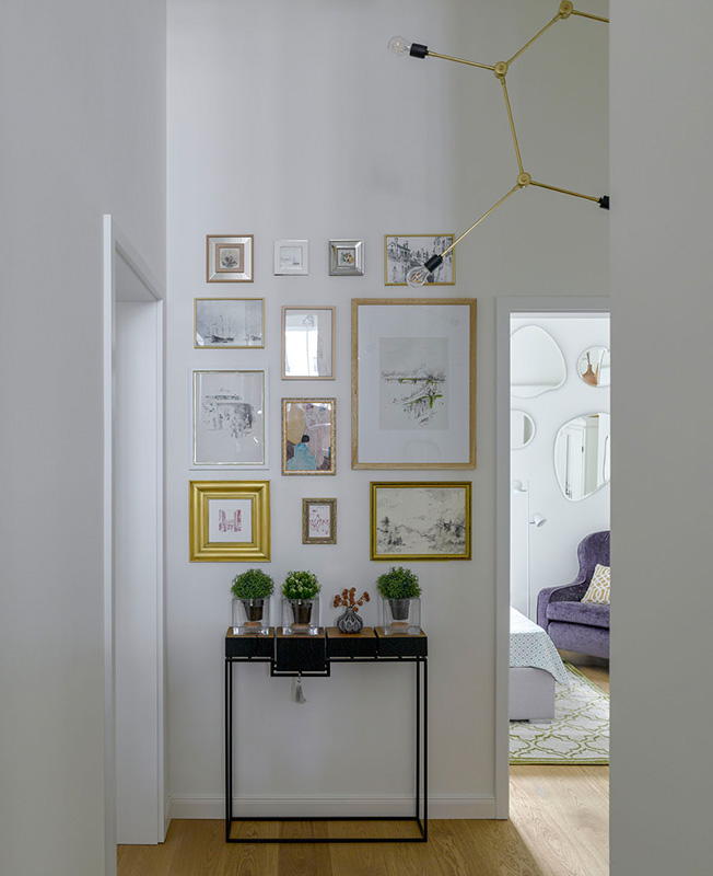 Стены декорированы изобретательно и довольно плотно: зеркала, фотографии, картины, панно, роспись — белая основа давала архитекторам свободу. Стены расписал Алексей Кио. Повсюду расставлены многочисленные аксессуары, на полках книги и посуда — создается впечатление, что здесь кто-то живет постоянно, нет ощущения «квартиры под сдачу».