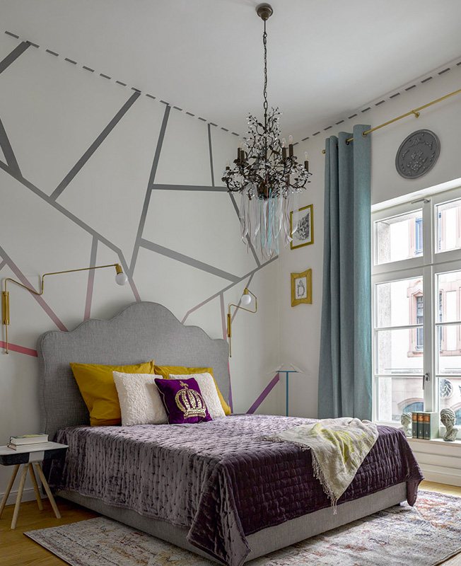 Хозяйская спальня. Кровать De Angeli. Вешалка Flai. Роспись стены: Алексей Кио. Рамки и панно над окном: Александр Новиков. Пунктирная линия отбивает потолок от стен.