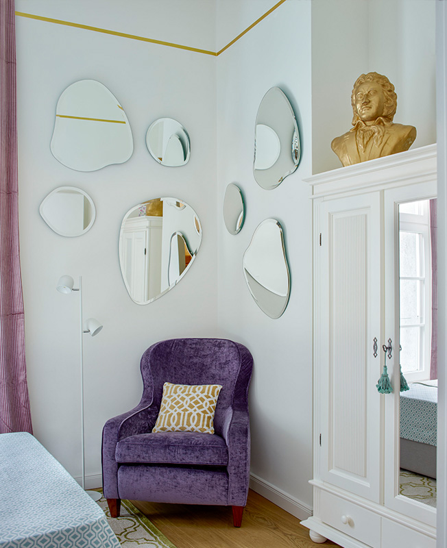 Гостевая спальня. Зеркала Cattelan Italia. Кресло De Angeli. Шторы из ткани JAB. Золотая полоса по периметру визуально опускает высокий потолок, что делает комнату для сна более уютной.