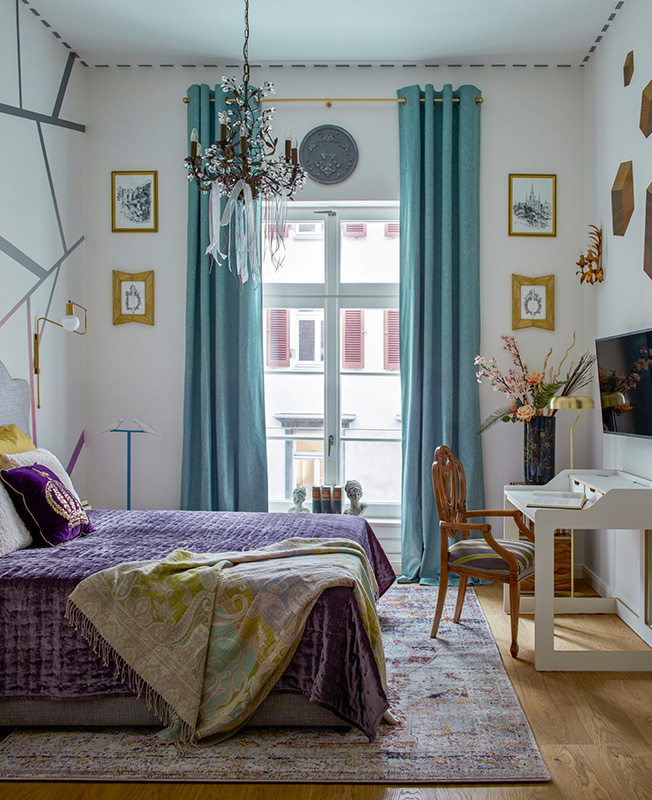 С помощью декора Хомяковы решали даже конструктивные задачи. Так, спальни оказались в старой части с очень высокими потолками и чтобы визуально сделать гостевую комнату пониже и уютнее, архитекторы пустили по периметру стен золотую полосу.