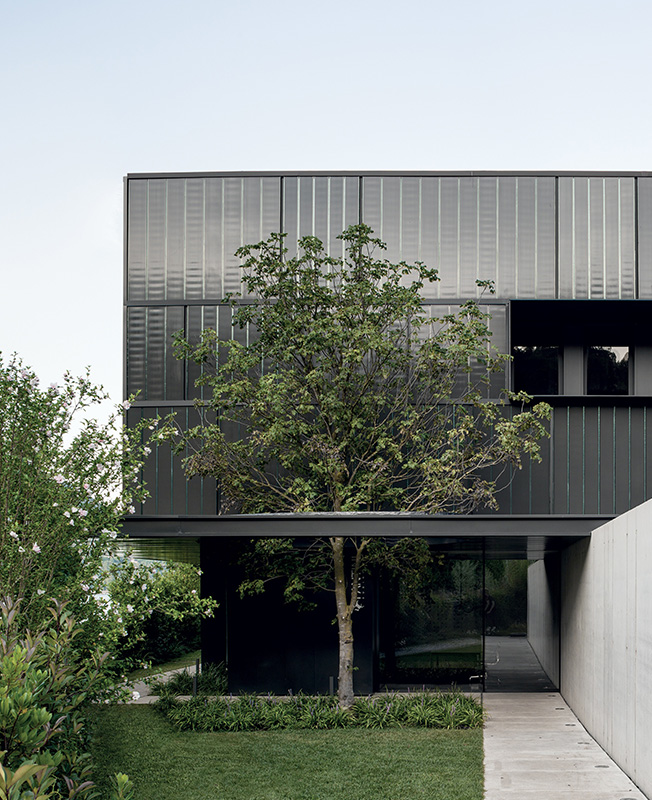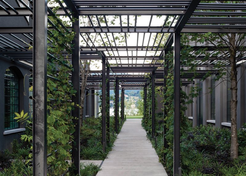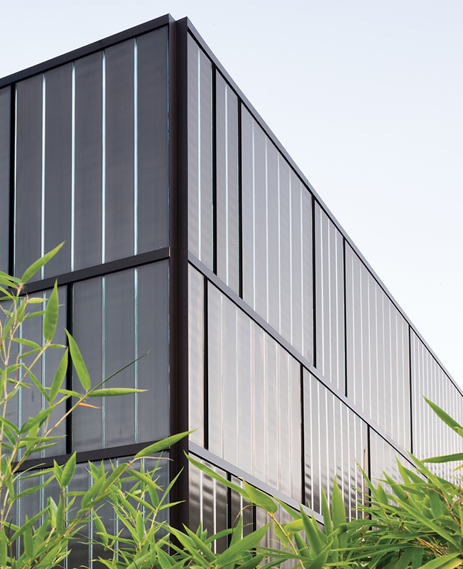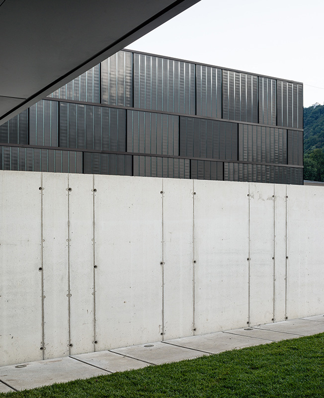 Темно-серая облицовка из U-стекла подобна «коже», которая придает комплексу и двум основным блокам фабрики единую визуальную чистоту и естественным образом интегрируют объекты в ландшафт.