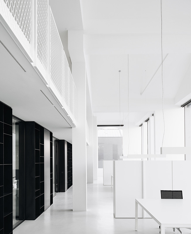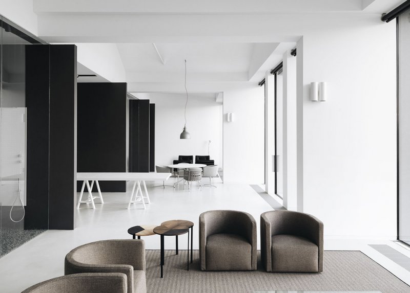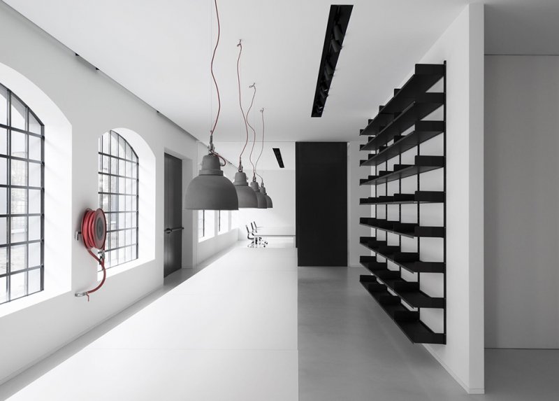 Некоторые из ключевых функций компании, такие как офисы и выставочный зал, были размещены на берегу озера. Большие застекленные фасады создают симбиотические отношения с окружающей средой и дарят интерьеру визуальную непрерывность. Промышленный характер архитектуры отчетливо обозначен выбором материалов: необработанного железобетона и металла.