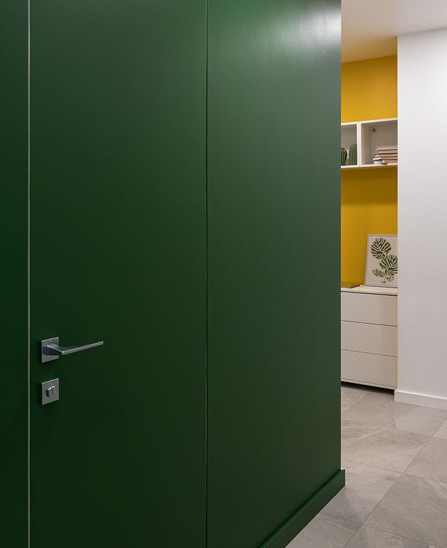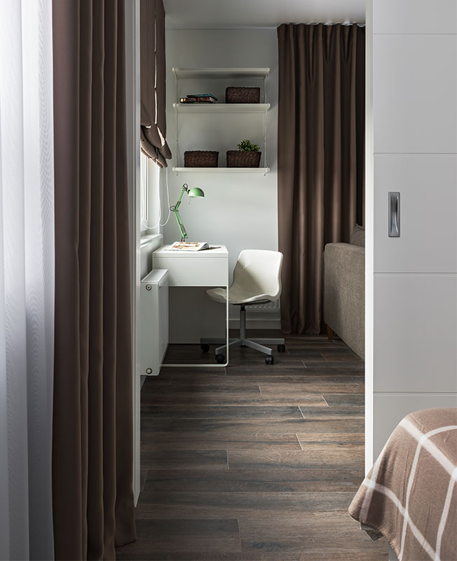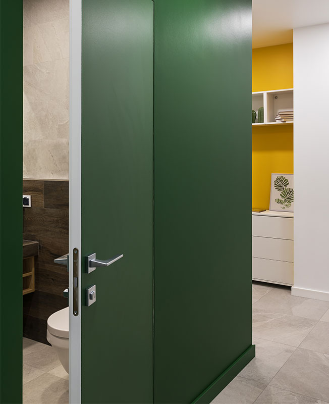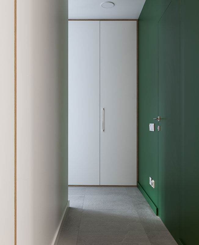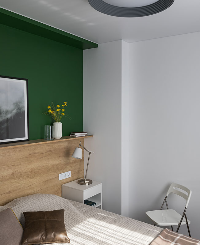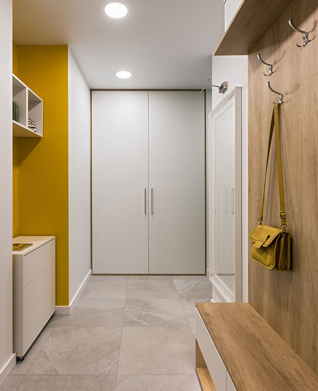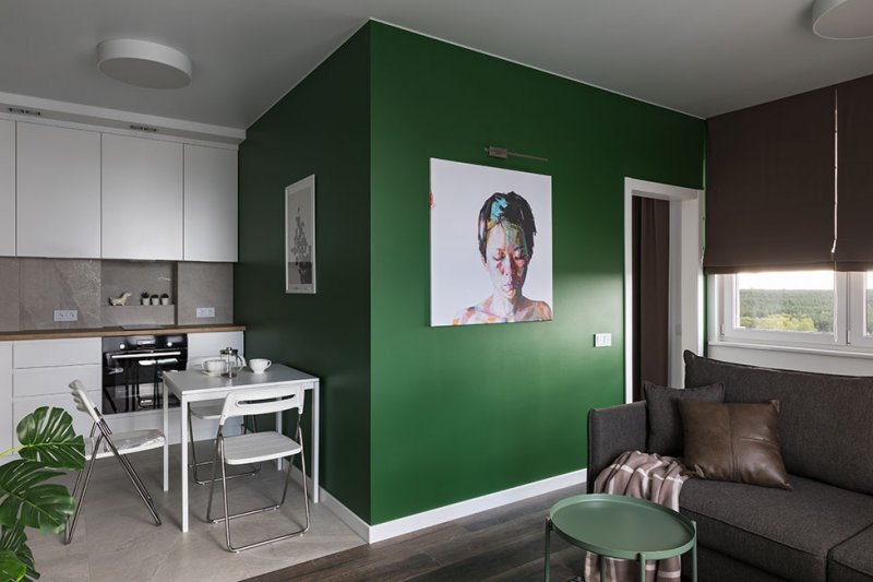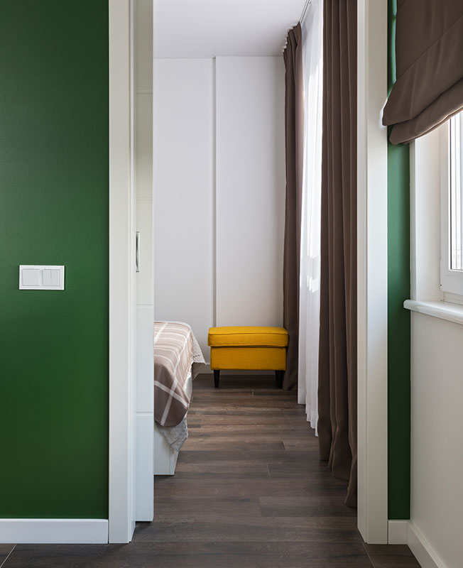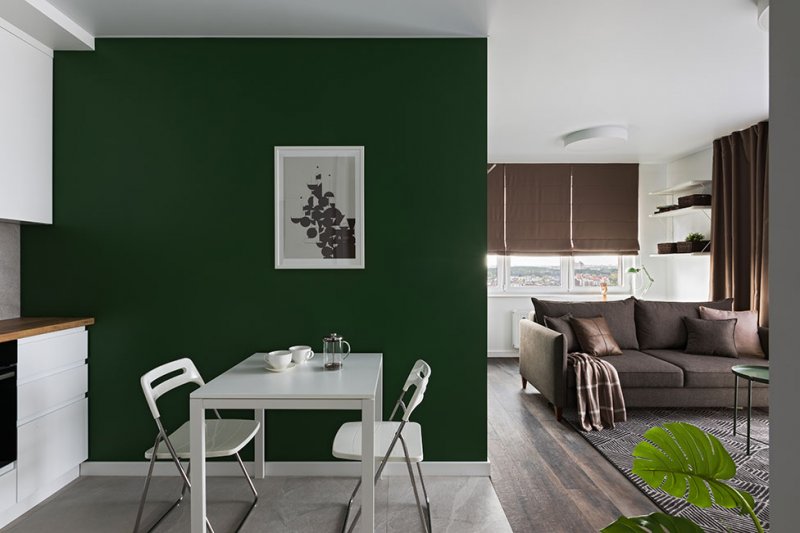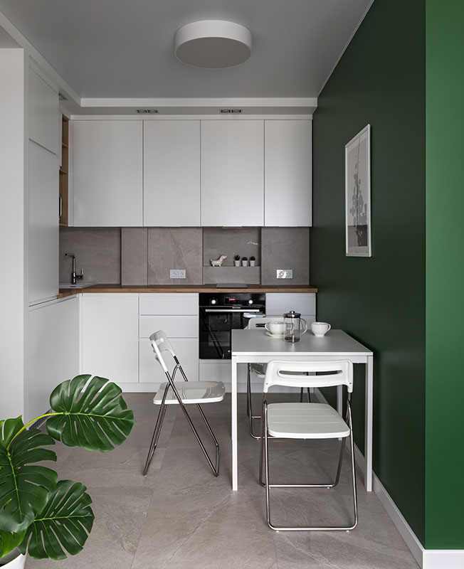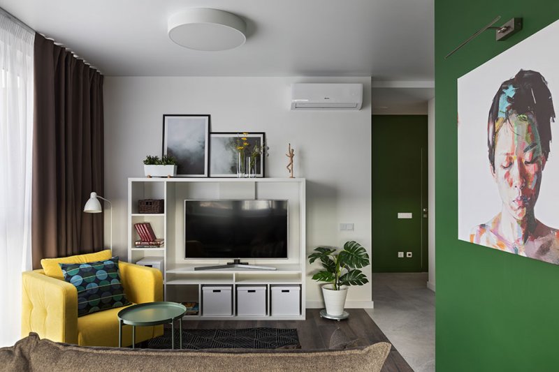 В условиях небольшого пространства за основу взяли белый цвет. Для зонирования и расстановки акцентов использовали хвойный зеленый и солнечный желтый с вкраплениями натуральной древесины и оттенками серого и коричневого.