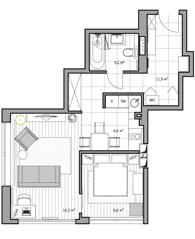 Жилье приобреталось специально под сдачу, а потому перед дизайнерами стояла задача реализовать проект максимально ярко, бюджетно и быстро, чтобы поскорее выставить квартиру на рынок арендной недвижимости.