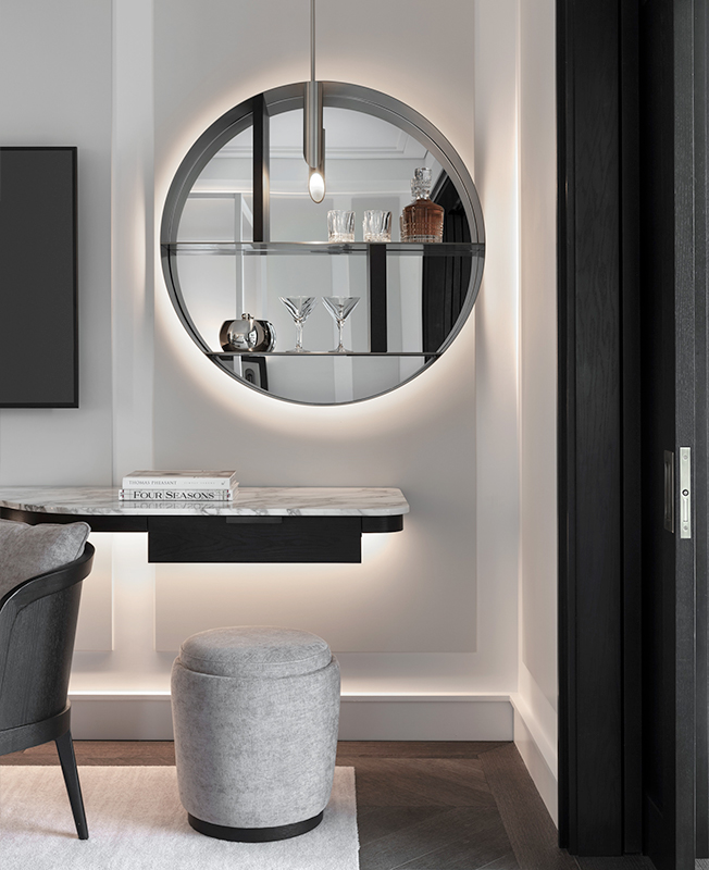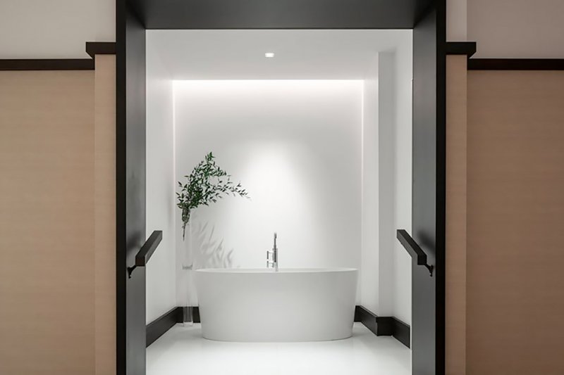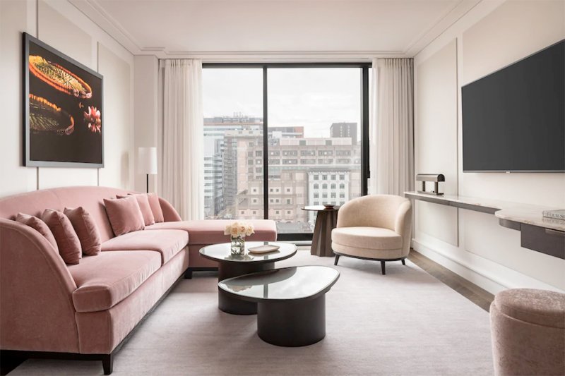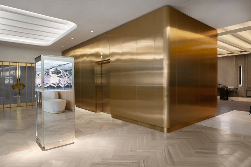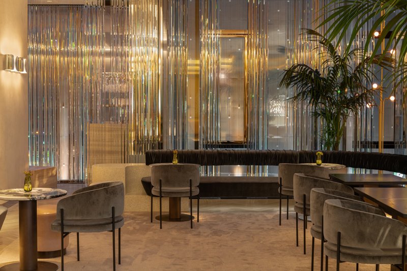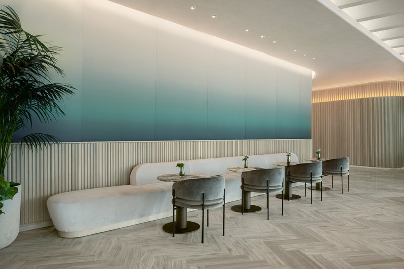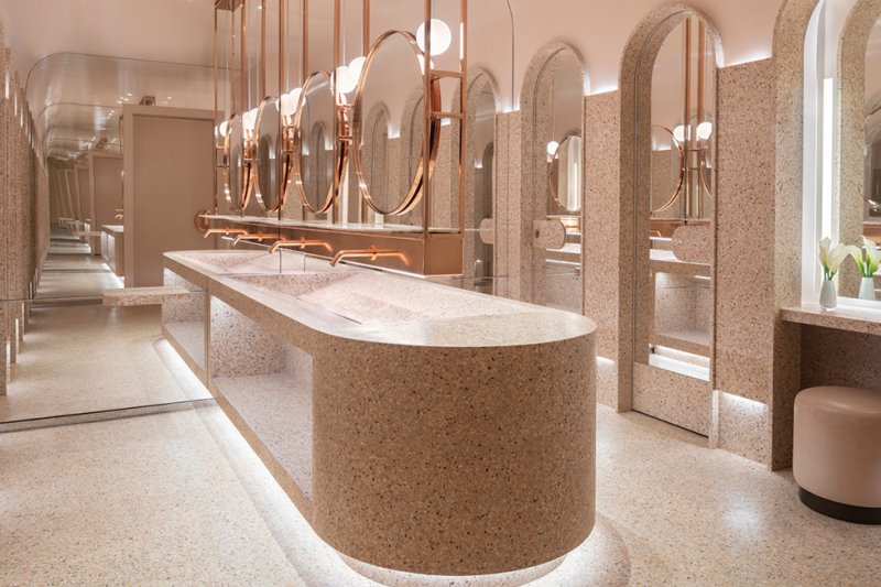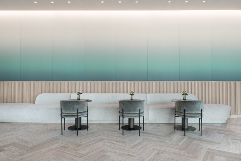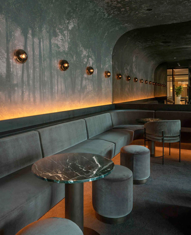 Общественные пространства эффектны, в духе тенденции Instagram-ready: стены «залиты» пастельным градиентом или облицованы золотистыми панелями, покрыты обоями с лесными узорами и дополнены латунными светильниками. Диваны и кресла затянуты в бархатистый текстиль сложных оттенков, а столешницы выполнены из мрамора разных сортов.