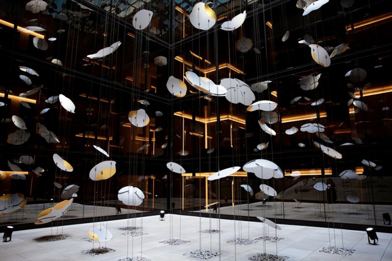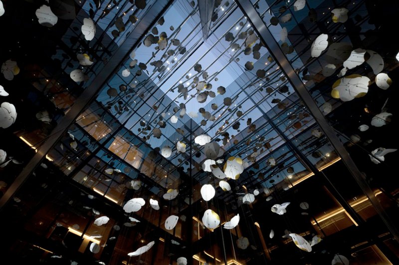 В сердце отеля поместили работу канадского скульптора Паскаля Жирардена. Подвесная инсталляция состоит из дестяков алюминиевых цветов, выкрешенных в белый и золотой. Закрепленные на тонких вертикальных тросах, они словно парят в воздухе.