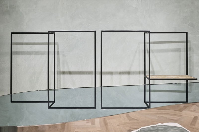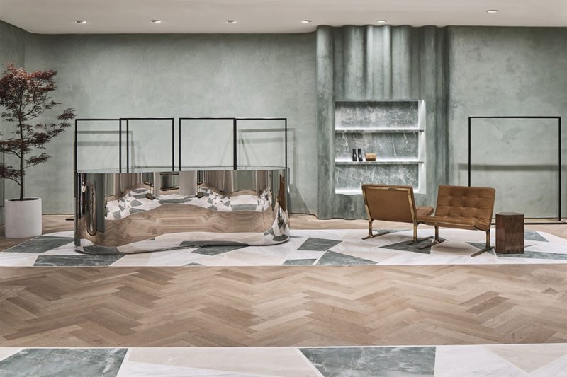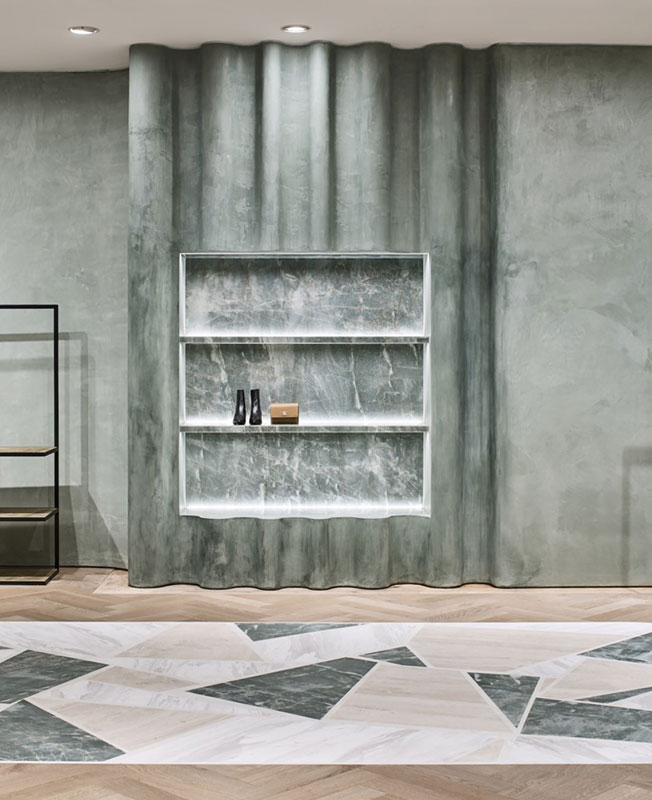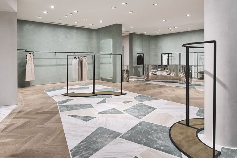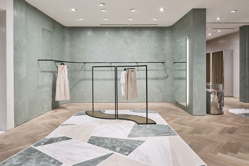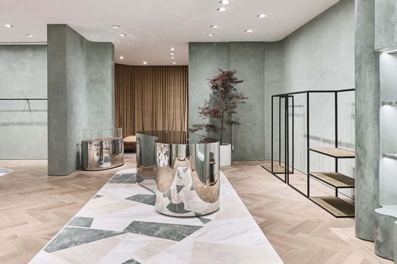 Интерьер магазина украшает зеленый мрамор Marmorino, черные светильники из стали и итальянские стеллажи из нубука. Примерочные оформлены бархатными шторами и кожаными креслами от бренда Nicos Zographos. Проектировщики предложили классический план, согласно которому череда комнат переводит покупателя из публичного в приватное пространство. На полу положена плитка Palladiana Terrazzo из кварца и классического травертина, который окаймлен специально окрашенными деревянными полами с раскладкой шевроном.