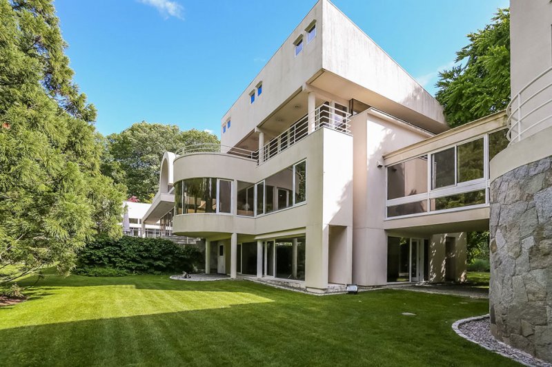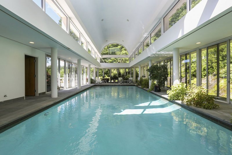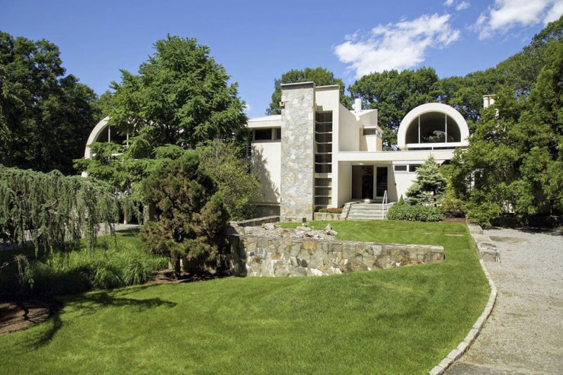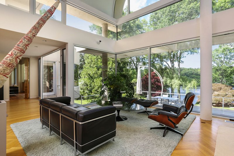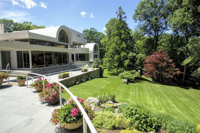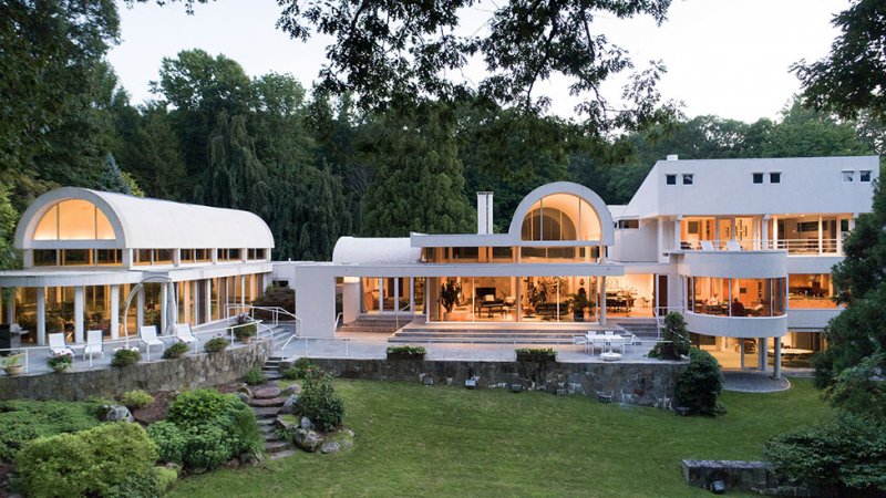 Pound Ridge — дом в штате Нью-Йорк с изогнутыми сводами и прямоугольными линиями, похож на музей современного искусства. Остекленный фасад в греческом стиле выходит на озеро Маллард и ландшафтный парк.