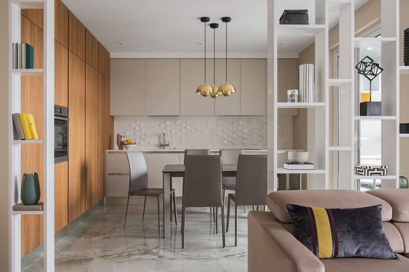 Но при этом более яркие помещения не выходят из диапазона палитры всей квартиры, чтобы не терялось ощущение единства. Основное пространство кухни-гостиной спокойное и сдержанное, но с фактурами и акцентами, которые способны привлечь взгляд».