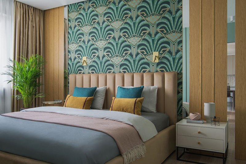 «Изначально заказчики видели будущее пространство в светлых бежевых тонах, но в ходе работы я поняла, что семье нравятся решения и посмелее, — рассказывает о проекте Юлия. — Так появилась аквамариновая спальня с активными изумрудно-золотыми тропическими обоями, графичный холл и яркая детская.