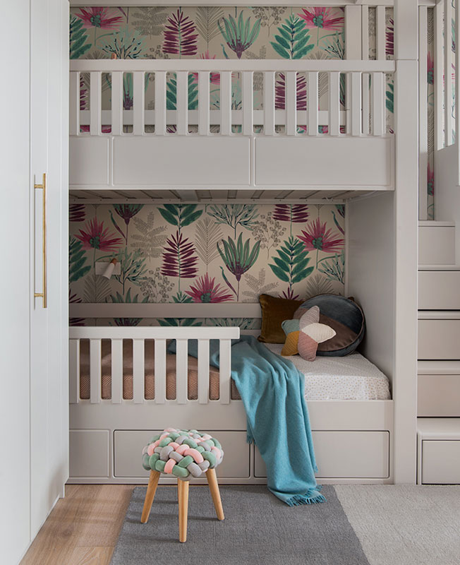 Детская. Обои Harlequin. Потолочный светильник Odeon Light. Кровать изготовлена на заказ по эскизам автора проекта. Декоративные подушки Zara home. Письменный стол и кресло La Redoute.