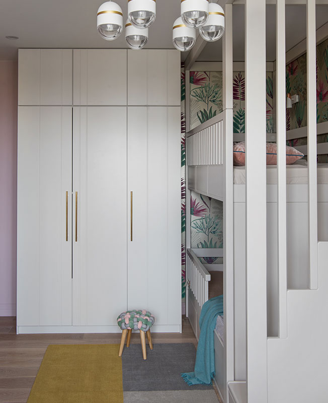Интересная история вышла с детской — в ходе реализации проекта заказчики узнали о пополнении в семье. Поэтому пространство проектировалось уже для двоих детей. В комнате предусмотрели системы хранения, место для детской кроватки и пеленального комода.
