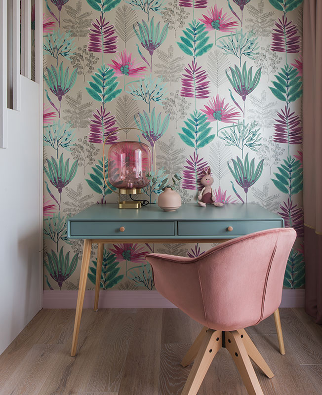 Фрагмент детской. Обои Harlequin. Письменный стол и кресло La Redoute. Декор Barcelona Design, Zara home. Зеркало Little Street. nonehttps://www.instagram.com/ulikma/https://www.facebook.com/yulia.ykamaninahttps://www.jk-home.ru/