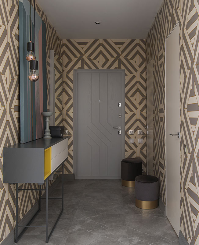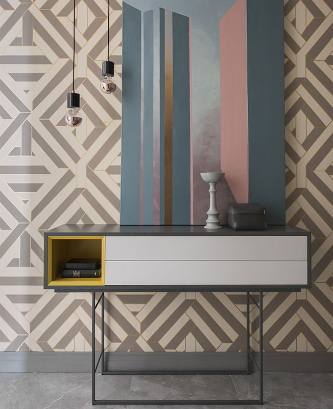 Прихожая. Межкомнатные двери Sofia doors. Обои Nobilis. Напольная плитка Italon. Консоль Bragin Design. Картина Anyhome. Подвесные светильники Paulmann. Подсвечник Barcelona Design.