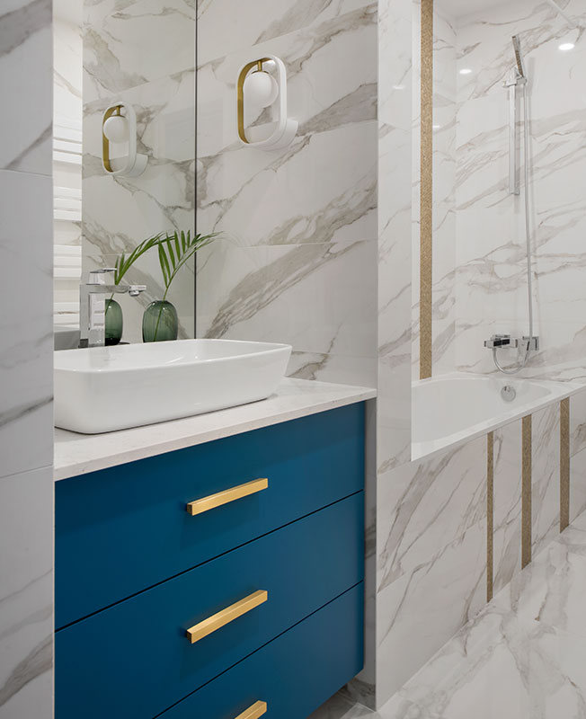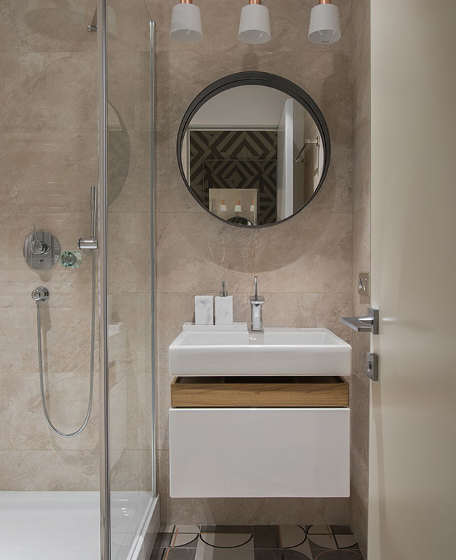 Ванная комната. Керамогранит Supergres. Мозаика L’antic colonial, салон Zodiac. Тумба под раковину со столешницей из кварца изготовлена на заказ по эскизам автора проекта. Сантехника Villeroy & Boch, Grohe.