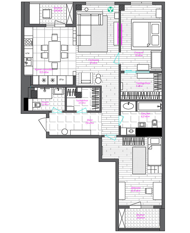 Площадь кухни и санузлов увеличили за счет коридоров, гостиную объединили с кухней и столовой — опен спейс зонировали двусторонним стеллажом. Также в квартире сформировали комнату родителей, детскую, две гардеробные, одна из которых примыкает к главной спальне, а вторая расположена в прихожей.