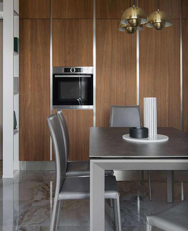 Фрагмент кухни. Кухня Venete Cucine, салон Gulia Novars. Обеденный стол и стулья Pranzo. Декор Barcelona Design, Happy Collection, H&M home.