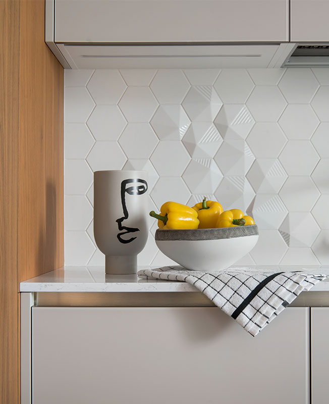 Фрагмент кухни. Столешница изготовлена из кварца. Плитка на фартуке Equipe. Декор Barcelona Design, Happy Collection, H&M home.