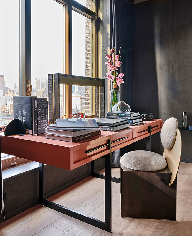 Модельная квартира на Орчард-стрит — проект Тимоти Годболда. Вдохновение автор черпал в дизайне 1970-х и 1980-х — ему показалось, что эта тема хорошо сочетается с окружением, в котором стоит этот дом на Манхэттене. Тимоти Голдболд известен как автор, вдохновляющийся фэшн. Все дело в его бэкграунде: он начала карьеру с работы в глянцевых журналах, после чего сотрудничал с Ральфом Лореном. Еще один конек Годболда — мастерское соединение современного дизайна и винтажа. Все свои таланты дизайнер продемонстрировал в новом проекте. Площадь квартиры 200 кв. метров. Бонус — 150-метровая терраса, где будущие владельцы будут пить кофе по утрам, наслаждаясь видами Нижнего Манхэттена. После чего они могут переместиться в просторный опен спейс, залитый светом из панорамных окон. Как говорит сам Тимоти Годболд, в интерьере он хотел воссоздать атмосферу Нижнего Ист-Сайта тех времен, когда были популярны панк-рок, Мадонна и Кит Харинг. Но — с буржуазным флером во вкусе яппи. Поэтому он не не мог обойтись без деревянных панелей с канеллюрами, полированного мрамора и дорогих дизайнерских вещей. Флер былых десятилетий Годболд создавал с помощью компонентов разных лет. Главное — не дата выпуска, а характер. «Уникальное кресло Saporiti — родом из 1950-х, но оно вошло в моду в 70-х, благодаря своим брутальным рубленым формам. В холле стул Celeste Лары Бохинк — одна из первых вещей, которую я купил для проекта, ее дизайн показался мне интересным. Над консолью Эрве Ван Дер Стратена — подвесные светильники студии Apparatus, я их просто обожаю. Важную роль в моем проекте играют работы Стефана Парментье, в них явно ощущается дух группы Memphis и Этторе Соттсасса. Его стол Bivio декадентский, весь в коже, но с замшевыми вставками на внутренней стороне основания, такой красивый! Над обеденным столом люстра Oslo из алебастра — невероятная работа французских мастеров из Atelier Alain Ellouz. Изготовленный на заказ столик из травертина в гостиной — дань моде на этот материал, которая царила в 80-е. Мужская спальня — маскулинная, темно-серая, роскошная. На стенах мягчайшая замша от Phillip Jeffries. Изголовье кровати сделано на заказ, проектируя его, я вдохновлялся знаменитым диваном DS-600 от De Sede. Изумительная находка — винтажная тумба в латуни и зеркалах. Она датируется 1982-м годом. Как видите, здесь много европейского дизайна. В то же время мне было важно, чтобы проект включал вещи американских ремесленников. Особенно восхищает подвесная кухонная полка от Amuneal. Ребята изготовили самую невероятную конструкцию из металла, которую я когда-либо видел, все сделано в Филадельфии вручную. Хороши и барные стулья, которые выполнила на заказ Thomas Hayes Studio — в их изгибах безошибочно узнаются восьмидесятые».