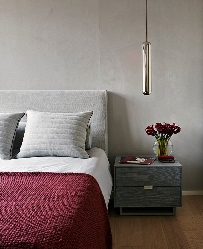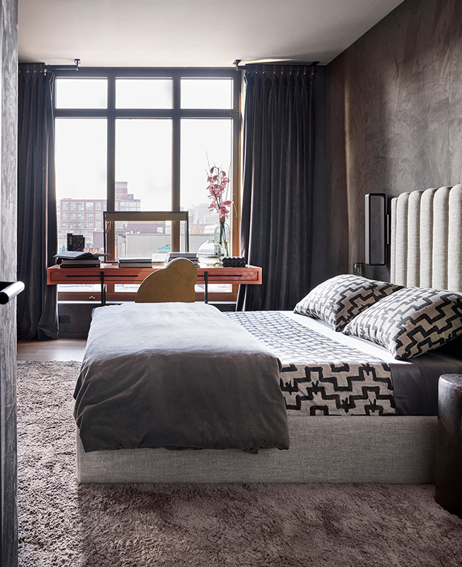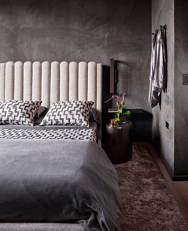 Мужская спальня — маскулинная, темно-серая, роскошная. На стенах мягчайшая замша от Phillip Jeffries. Изголовье кровати сделано на заказ, проектируя его, я вдохновлялся знаменитым диваном DS-600 от De Sede. Изумительная находка — винтажная тумба в латуни и зеркалах. Она датируется 1982-м годом.