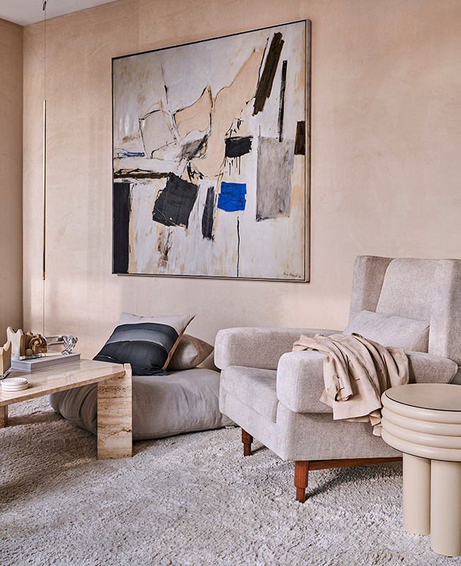 Над обеденным столом люстра Oslo из алебастра — невероятная работа французских мастеров из Atelier Alain Ellouz. Изготовленный на заказ столик из травертина в гостиной — дань моде на этот материал, которая царила в 80-е.
