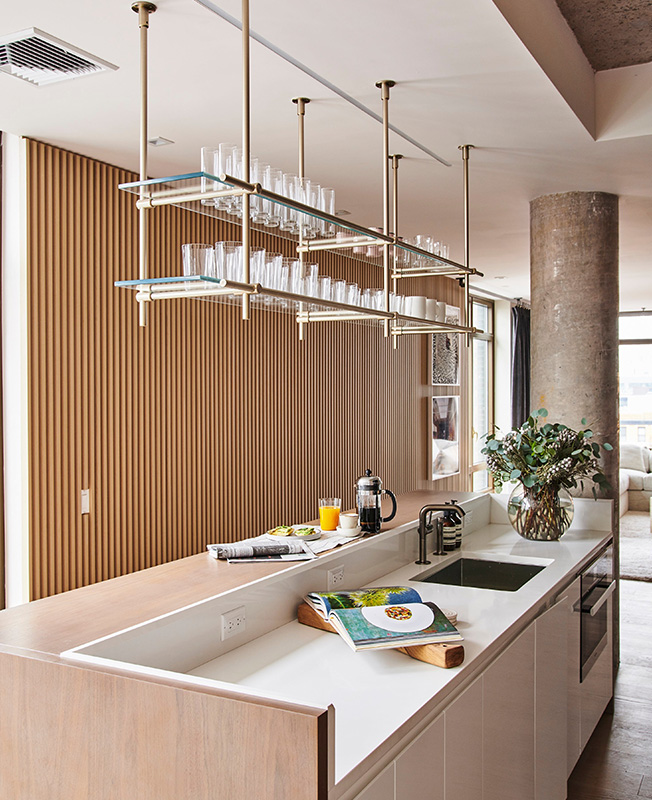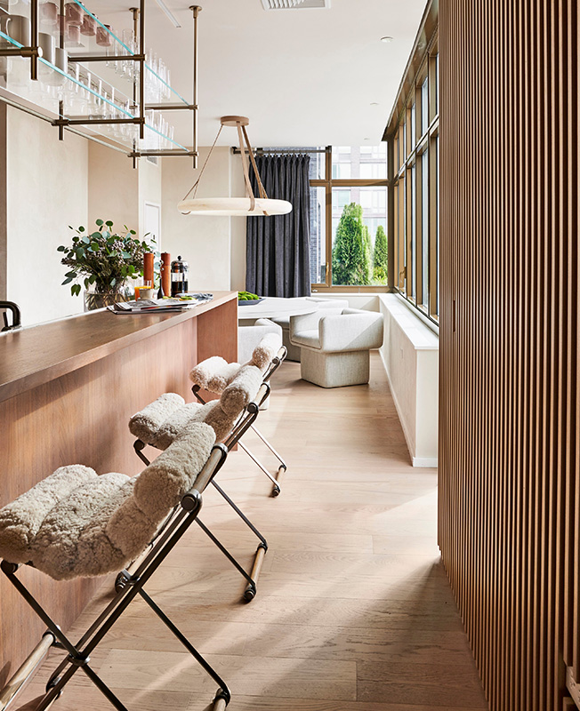 Как видите, здесь много европейского дизайна. В то же время мне было важно, чтобы проект включал вещи американских ремесленников. Особенно восхищает подвесная кухонная полка от Amuneal. Ребята изготовили самую невероятную конструкцию из металла, которую я когда-либо видел, все сделано в Филадельфии вручную. Хороши и барные стулья, которые выполнила на заказ Thomas Hayes Studio — в их изгибах безошибочно узнаются восьмидесятые».