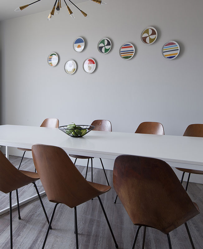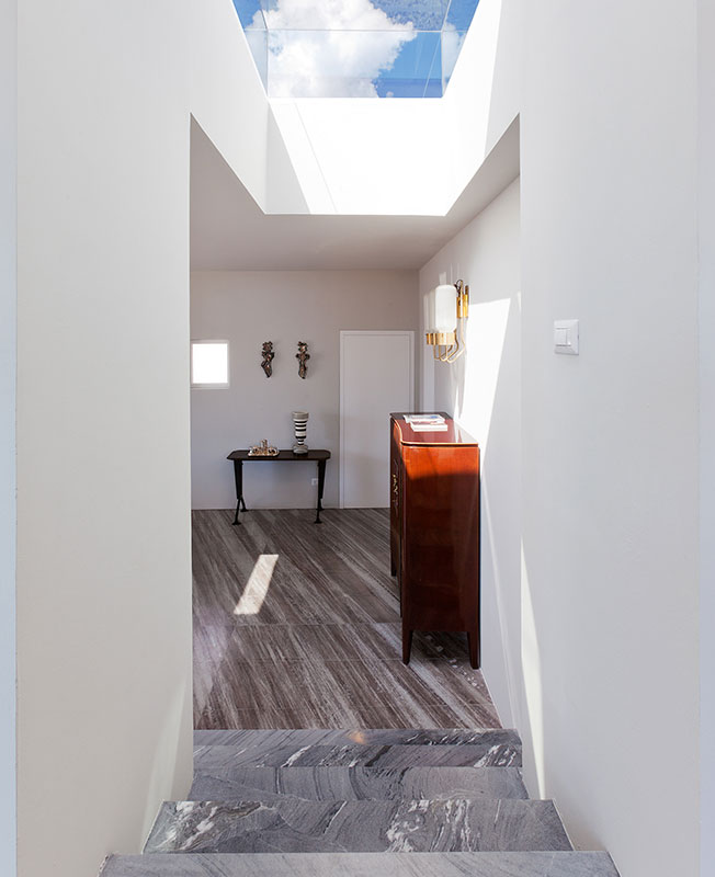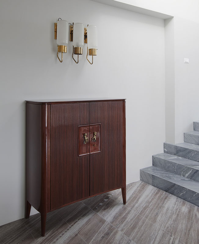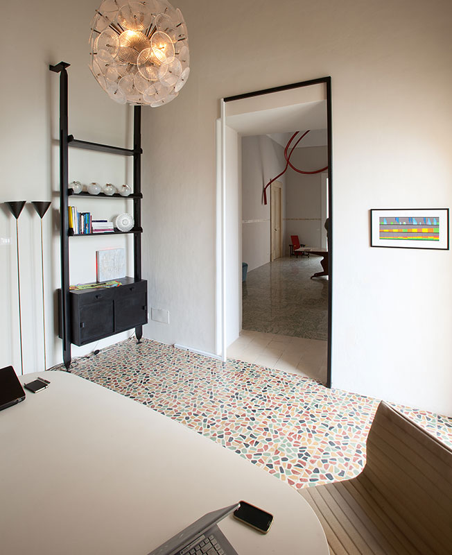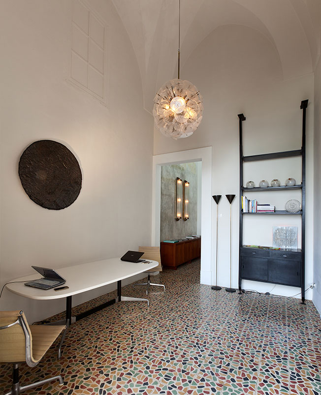 Первый этаж постоянно меняется — это место для выставок, где можно разместить инсталляции, в то время как в спальнях и гостиных аккуратно расставлены раритеты — предметы дизайна Джо Понти, Качча Доминиони, Освальдо Борсани, Этторе Соттсасса, вещи от Frattini, Stilnovo, ArteLuce наряду с современными произведениями художников Эдуарда Хабичера, Раффаэле Квида, Джованни Ламоргезе и Луиджи Веронези.