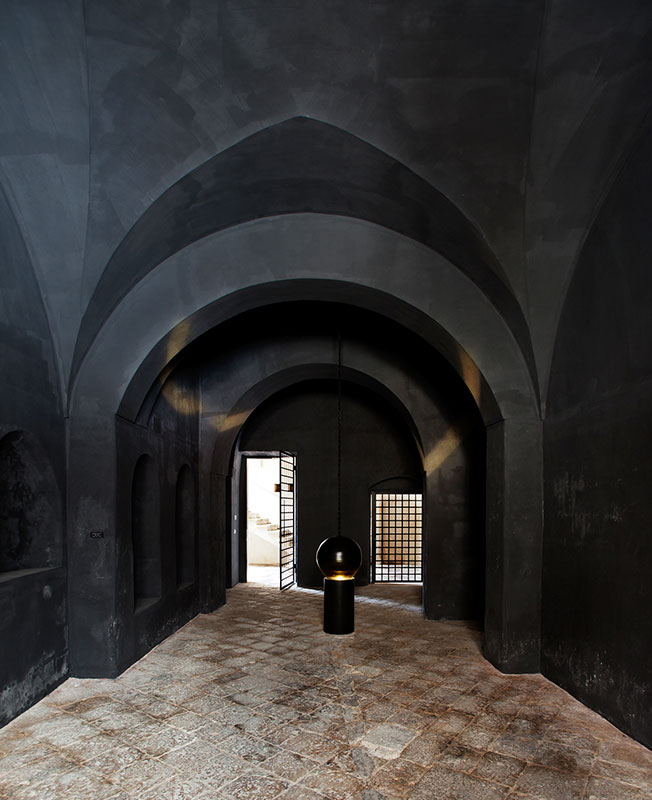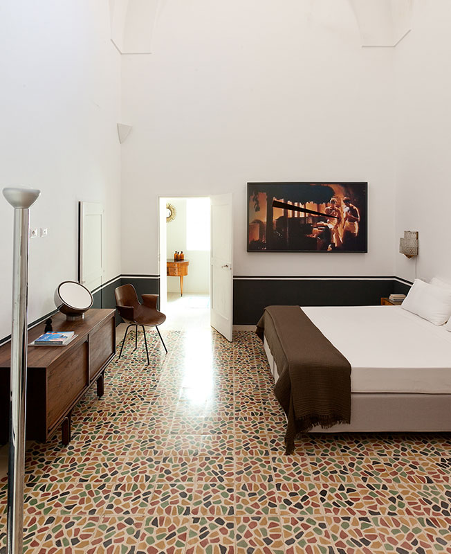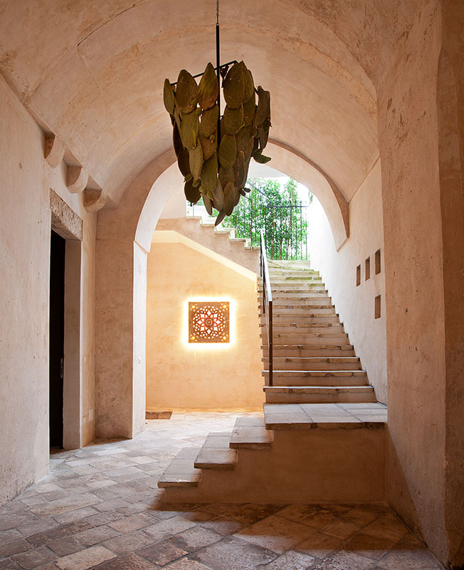 Галатина — старинный городок эпохи барокко с небольшими белыми домами и каменными особняками в средиземноморском стиле. Когда Кристиан Пиццинини и Антонио Лодовико Сколари, энтузиасты дизайна, наткнулись на это заброшенное палаццо, когда-то принадлежавшее благородной семье Монжио дель Элефанте, это был удар в самое сердце. Вдохновленные барочным пространством и своеобразным характером здания, они решили превратить дворец в нетрадиционную резиденцию и арт-галерею.