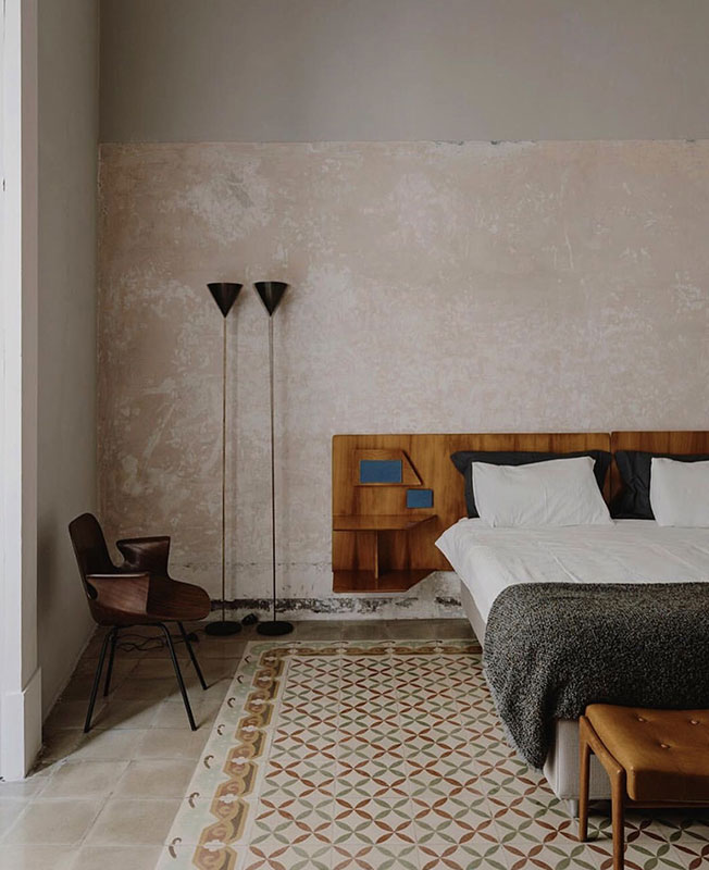 Гостиница распределяется на двух уровнях: первый этаж имеет три эклектичных комнаты для гостей и выставочное пространство, а на верхнем — отдельная квартира с террасой.