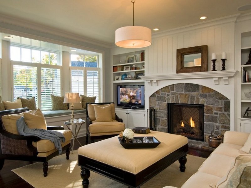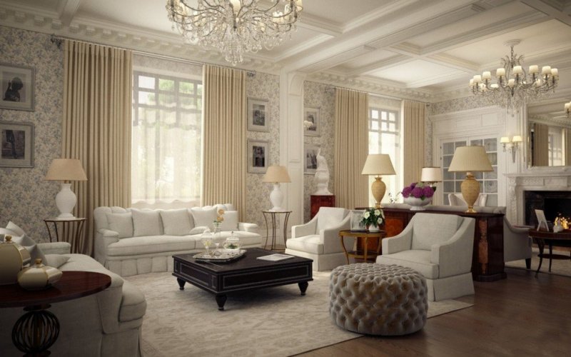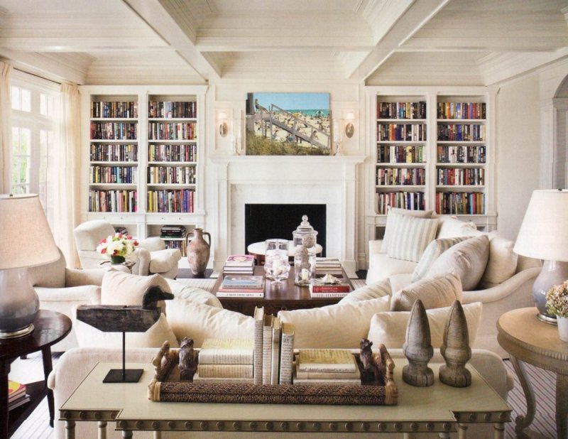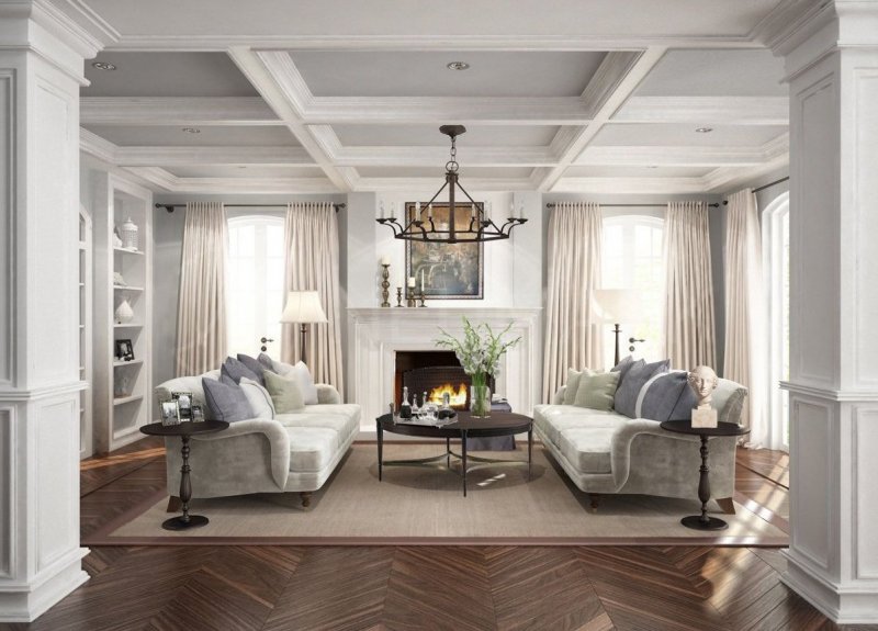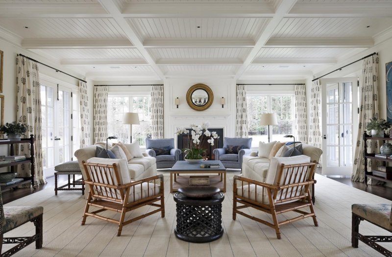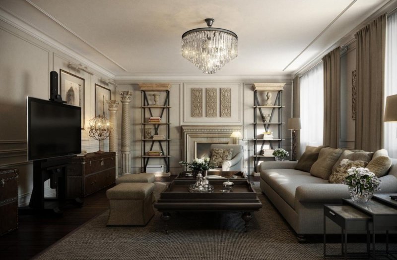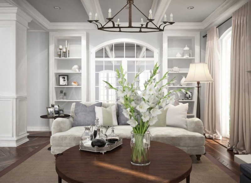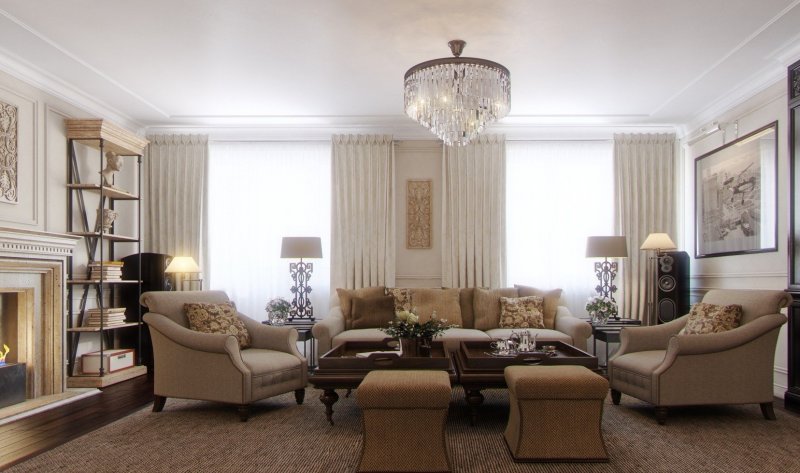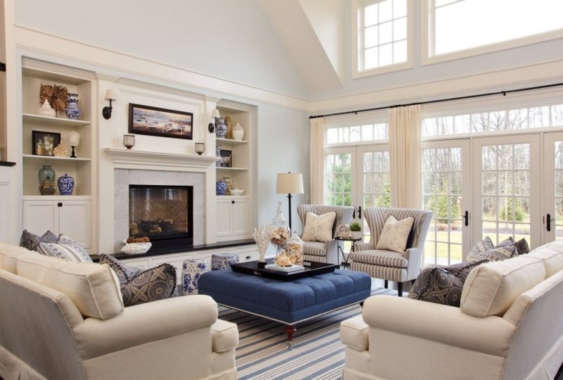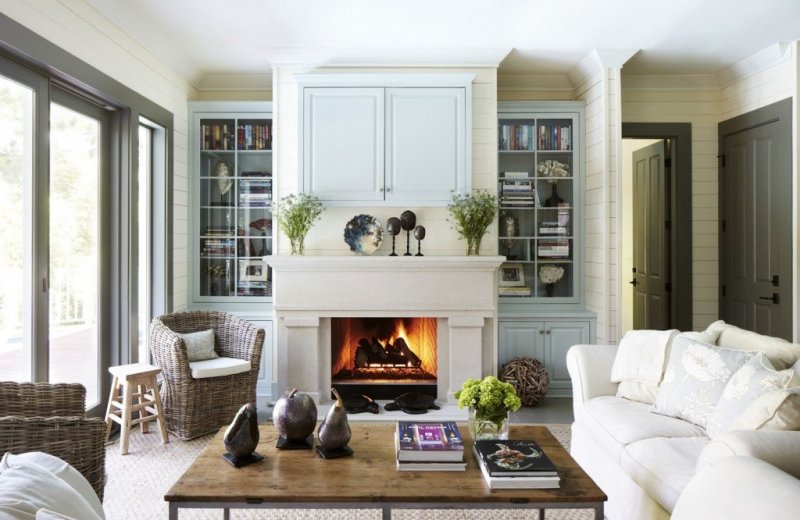 Необходимо так обустроить гостиную, чтобы она оставалась комфортной, светлой и просторной. Главная роль отводится массивной мягкой мебели, которую лучше расположить в центральной части комнаты около камина или большой телевизионной панели. Кресла и диван концентрируются вокруг миниатюрного журнального столика. Между предметами выдерживается достаточно серьезная дистанция. Вместо мягких кресел, из гарнитура могут использоваться плетеные аналоги. Технические устройства, библиотеку, декоративные элементы располагают в специально оборудованных нишах. Горизонтальные поверхности, как правило, свободны от декора и гаджетов. В интерьере недопустимо использование крупногабаритных шкафов или стеллажей.