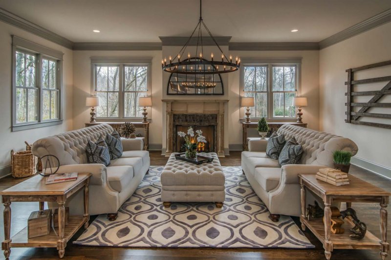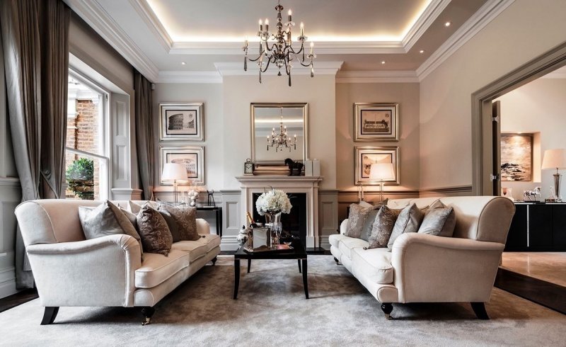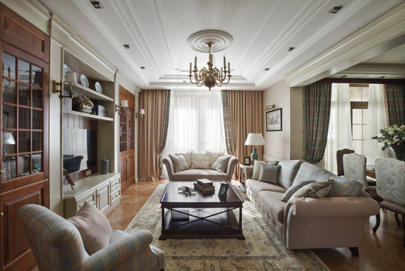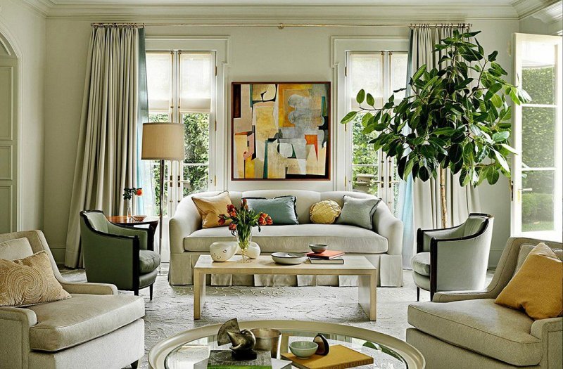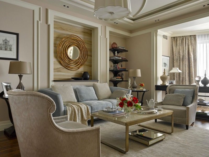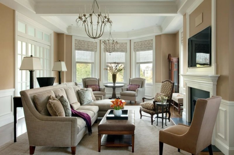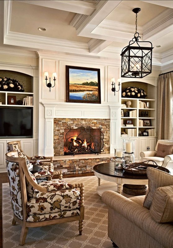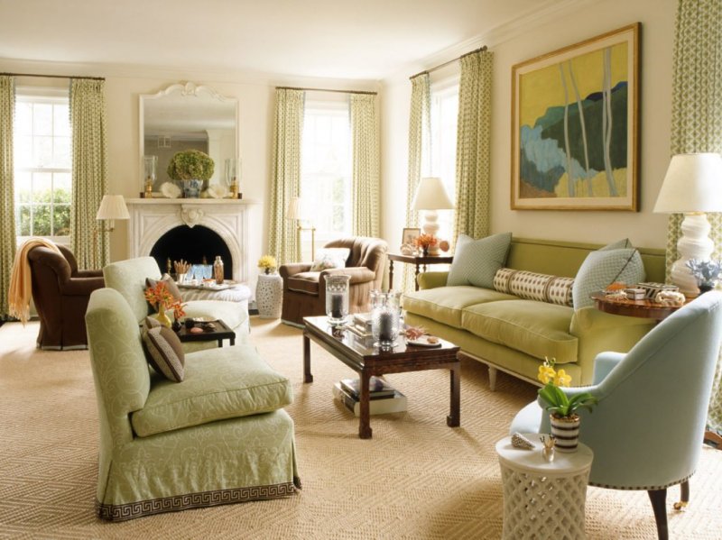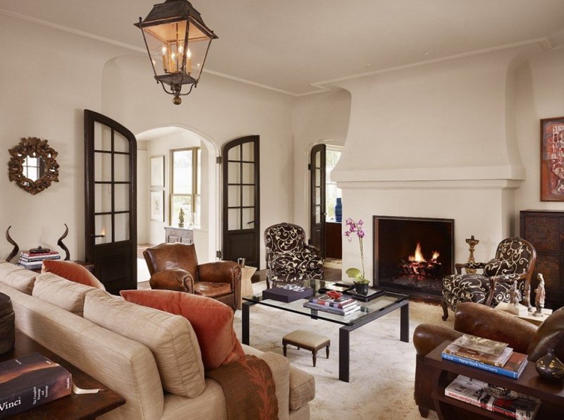 Необходимо так обустроить гостиную, чтобы она оставалась комфортной, светлой и просторной. Главная роль отводится массивной мягкой мебели, которую лучше расположить в центральной части комнаты около камина или большой телевизионной панели. Кресла и диван концентрируются вокруг миниатюрного журнального столика. Между предметами выдерживается достаточно серьезная дистанция. Вместо мягких кресел, из гарнитура могут использоваться плетеные аналоги. Технические устройства, библиотеку, декоративные элементы располагают в специально оборудованных нишах. Горизонтальные поверхности, как правило, свободны от декора и гаджетов. В интерьере недопустимо использование крупногабаритных шкафов или стеллажей.