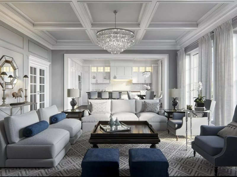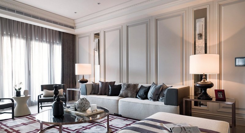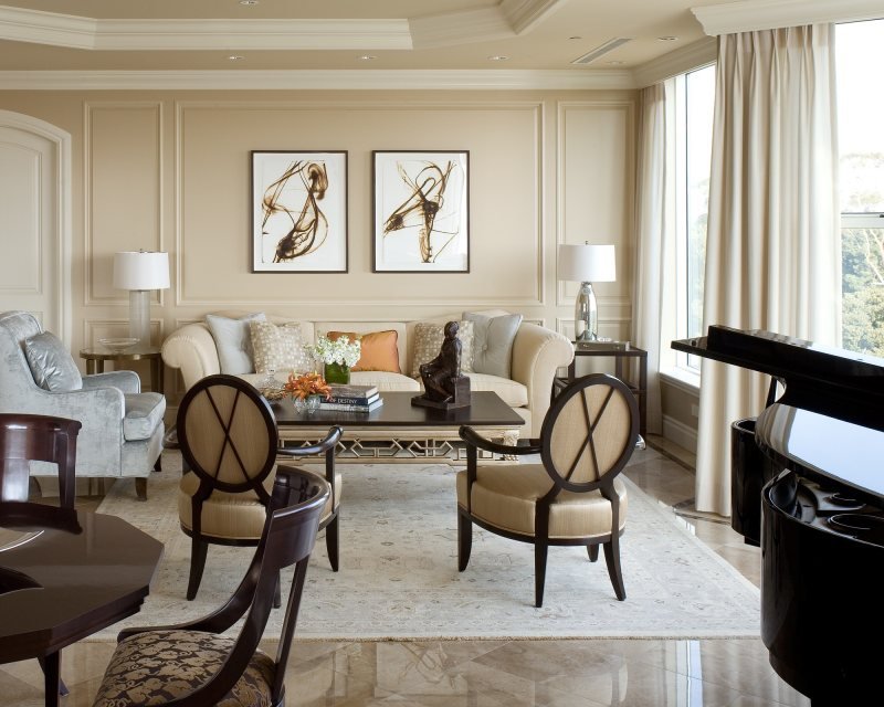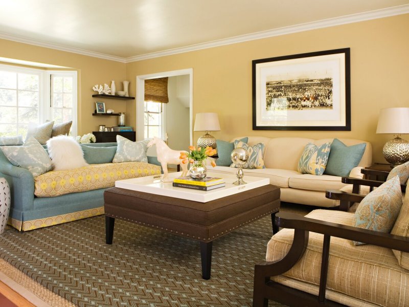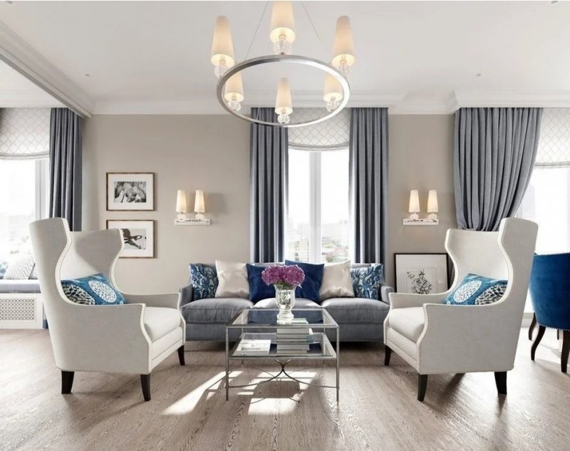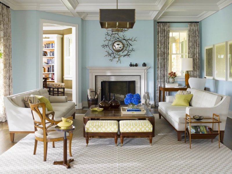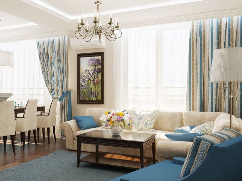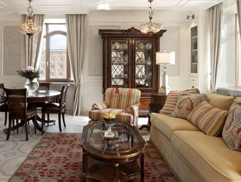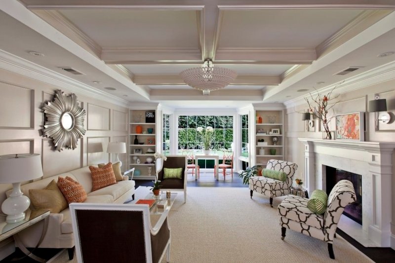 Необходимо так обустроить гостиную, чтобы она оставалась комфортной, светлой и просторной. Главная роль отводится массивной мягкой мебели, которую лучше расположить в центральной части комнаты около камина или большой телевизионной панели. Кресла и диван концентрируются вокруг миниатюрного журнального столика. Между предметами выдерживается достаточно серьезная дистанция. Вместо мягких кресел, из гарнитура могут использоваться плетеные аналоги. Технические устройства, библиотеку, декоративные элементы располагают в специально оборудованных нишах. Горизонтальные поверхности, как правило, свободны от декора и гаджетов. В интерьере недопустимо использование крупногабаритных шкафов или стеллажей.