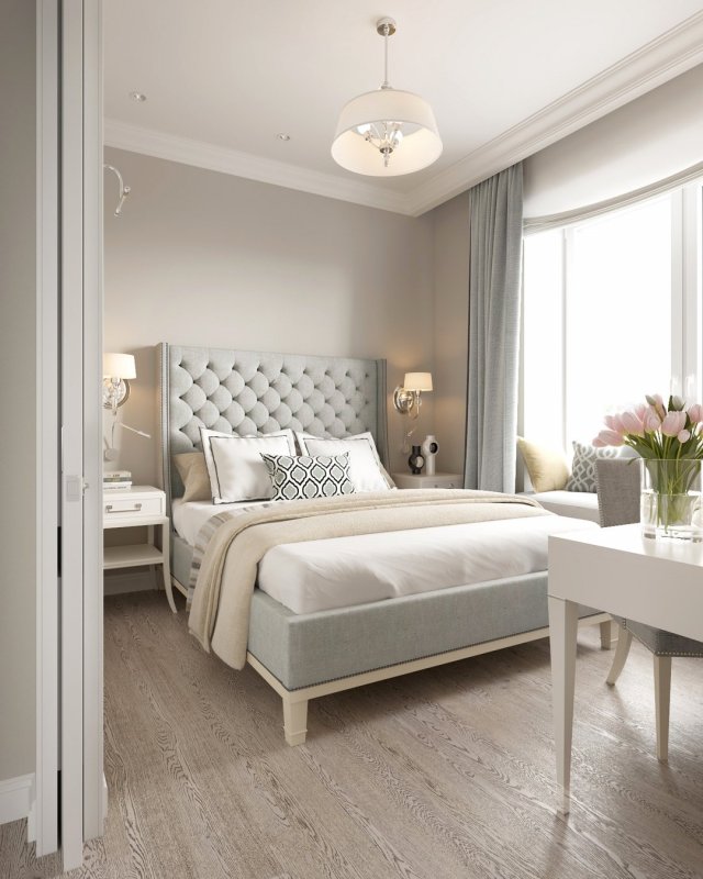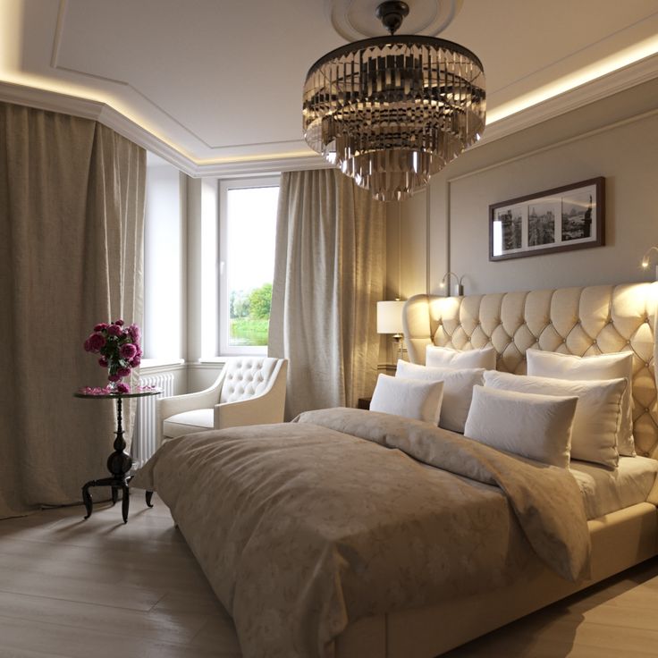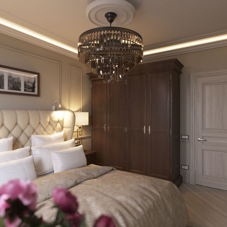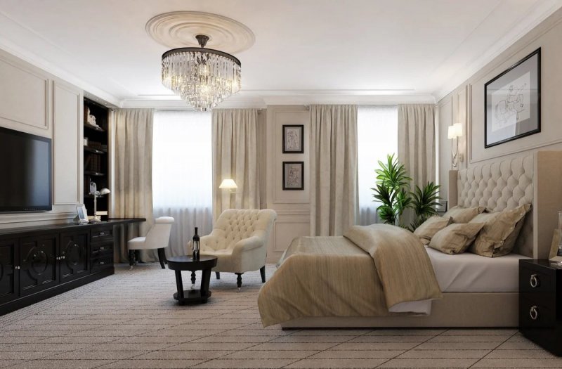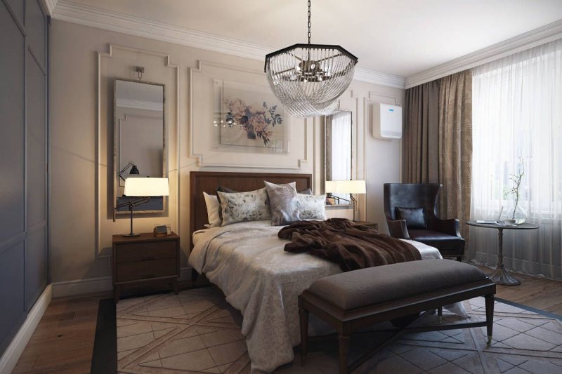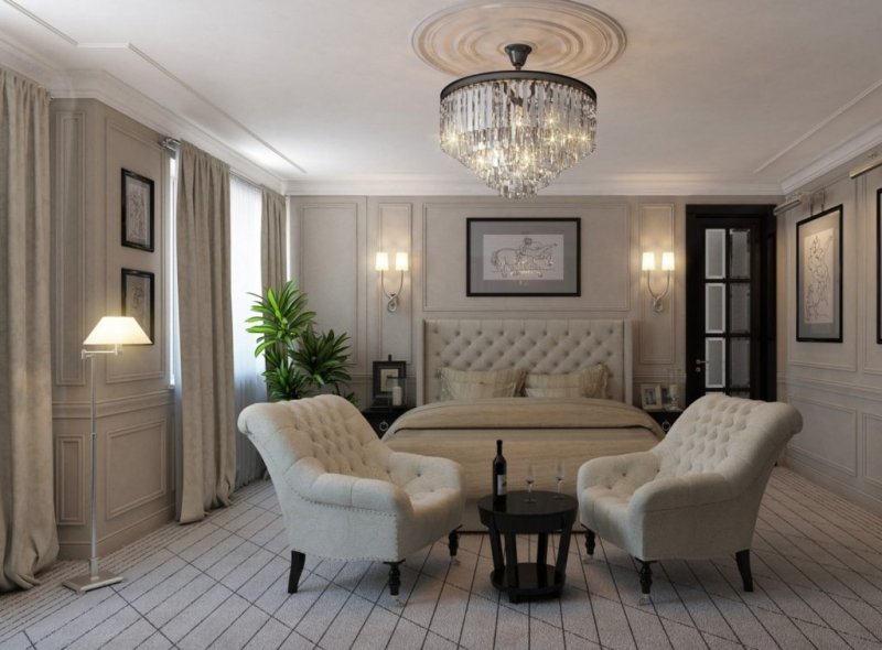 В спальнях может сочетаться классика и кантри. Здесь присутствует внушительная габаритная мебель, светлые пастельные тона и уютный текстиль. Для спального места характерно наличие высокого изголовья и банкетки со стороны ног. С двух сторон от изголовья размещаются две прикроватные тумбочки, оснащенные выдвижными ящичками и светильниками – настольными или бра. Для размещения постельного белья и одежды стоит предусмотреть комод, а если пространство позволяет – вместительный шкаф-купе или гардеробную. В современные интерьеры органично вписываются плетеные кресла и кровати из металла.