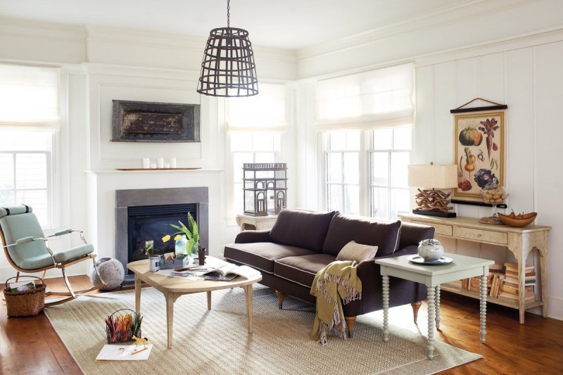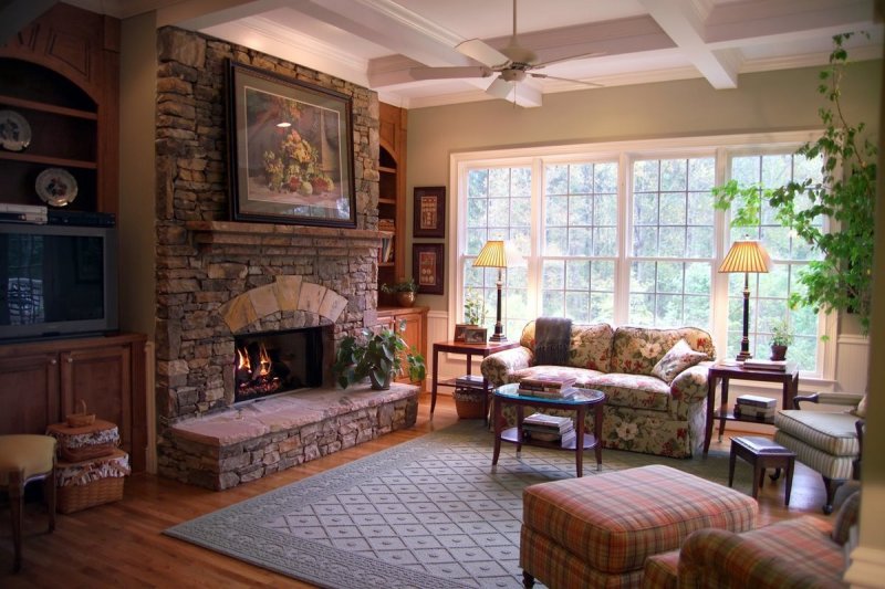 Направление зародилось в богатых загородных домах, а вовсе не в глубинке, как многие считают. Дешевизна и аскетизм не являются определяющими чертами данного стиля. Деревянная отделка стен, пола, открытые балки на потолке, грубая мебель из необработанной древесины – характерные черты кантри. Неотъемлемый атрибут гостиной – камин перед зоной для отдыха с комфортной мягкой мебелью, обитой кожей или грубыми тканями с натуральным составом. Стиль чрезвычайно приближен к природе, поскольку основывается на использовании экологичных материалов и естественной цветовой гаммы.